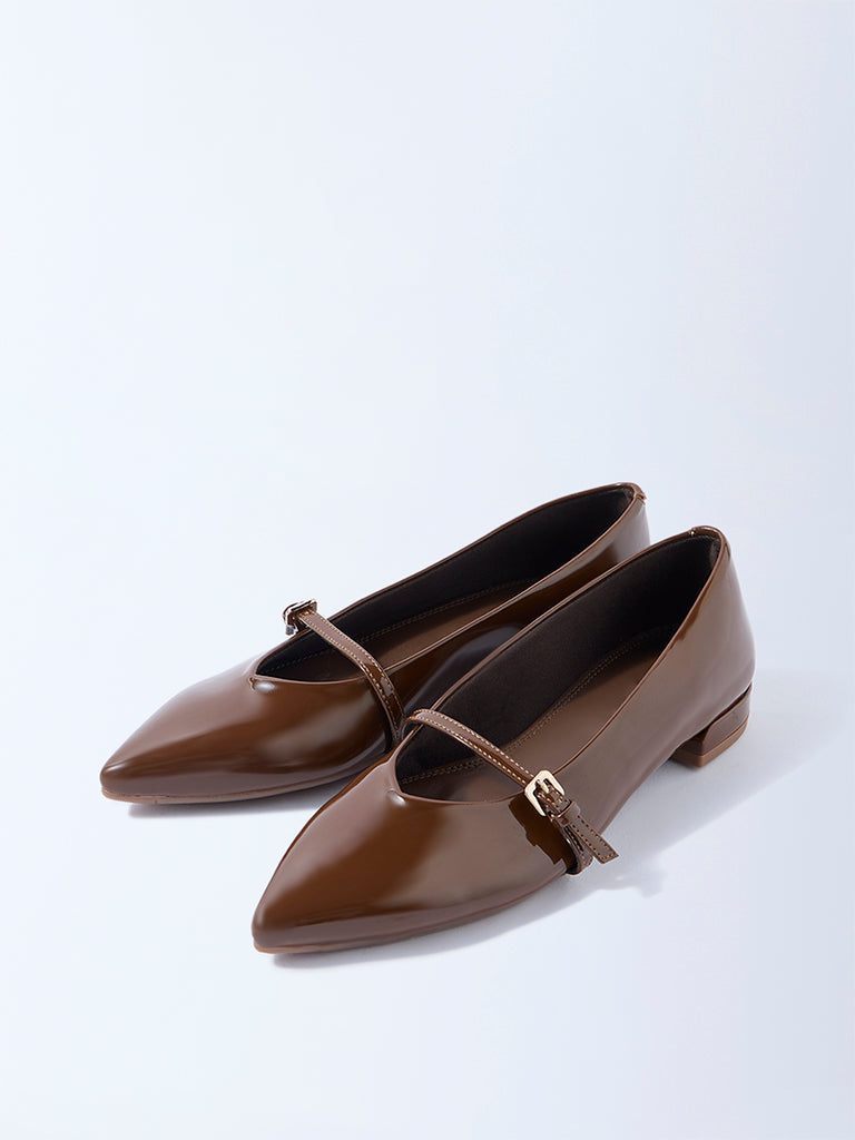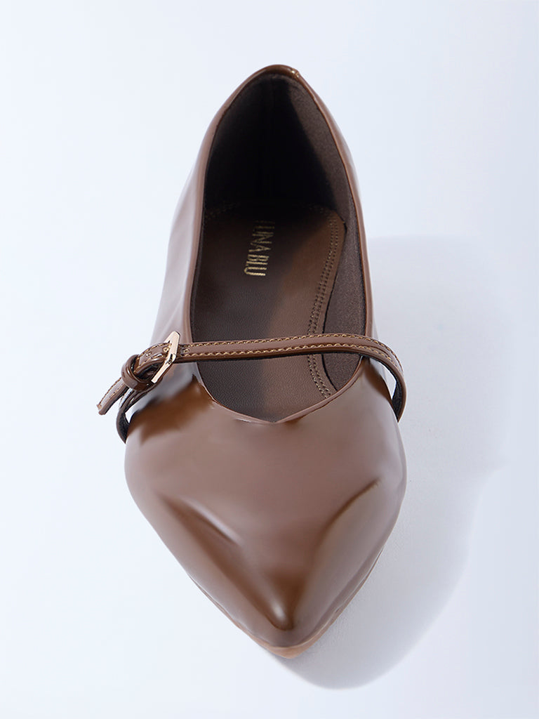 Luna Blu presents these brown mary jane shoes with a modern twist on a classic silhouette. Designed with a sleek pointy toe and glossy finish. they feature a slim buckle strap for added detail and security. The low block heel ensures comfort. making them perfect for both daytime wear and evening occasions.