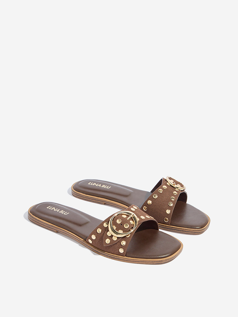 Luna Blu launches these brown slides. designed with gold-toned studs on a single strap. highlighting a statement buckle for a striking finish. The slip-on silhouette ensures effortless wear. while the padded footbed and textured outsole provide all-day ease and stability.