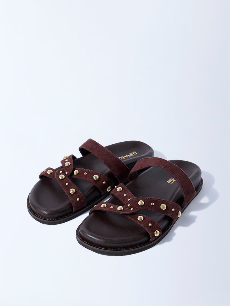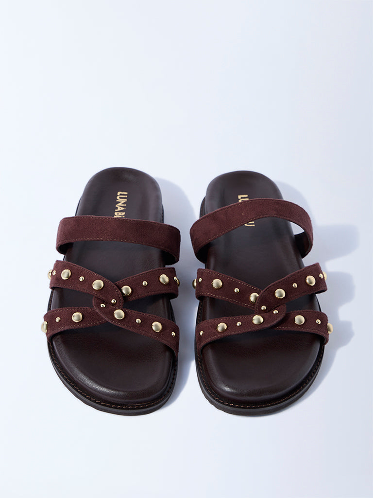 Make an effortless statement with these brown sandals from Luna Blu. Framed with soft suede straps embellished with gold-tone studs. the pair captures a bold yet easy-going appeal. Designed with padded footbeds and textured outsoles. they deliver comfort and grip for relaxed everyday wear.