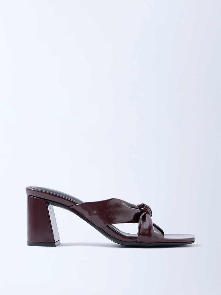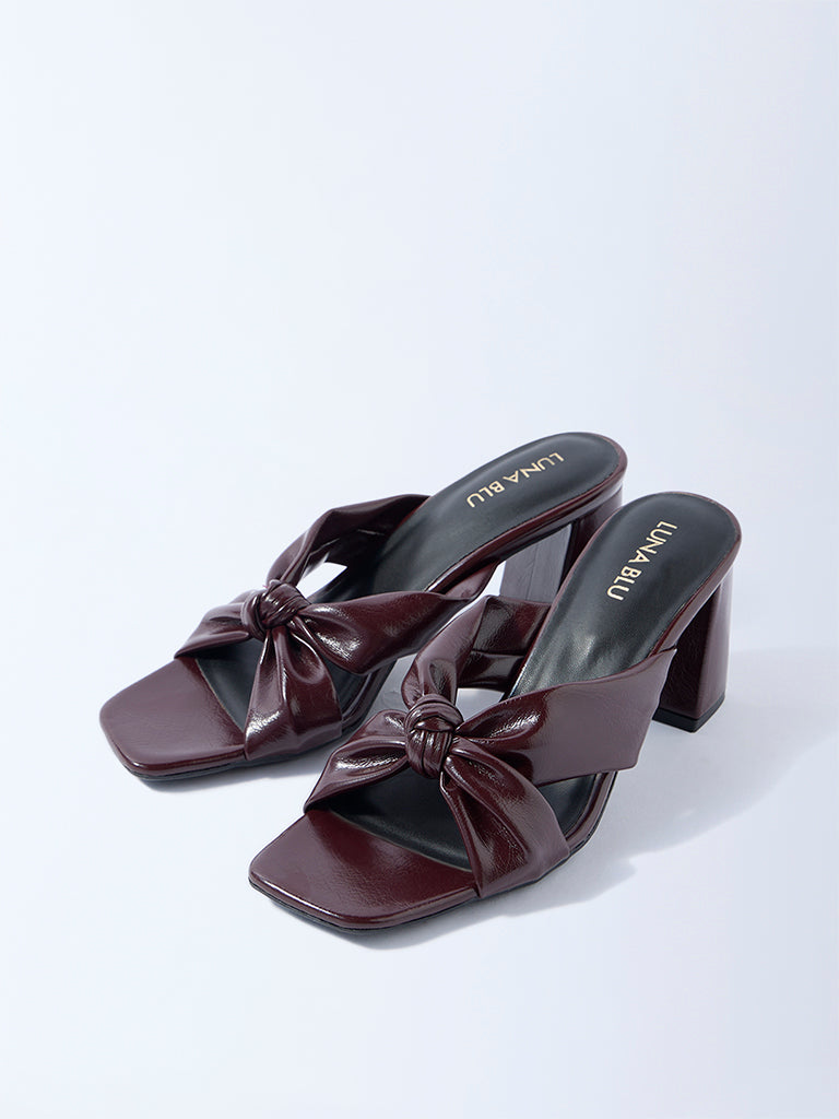 These burgundy block heel sandals from Luna Blu showcase a modern square-toe silhouette with bold knot detailing across the front. The glossy finish lends a polished edge. while the sturdy block heel offers both height and comfort. A statement style that transitions easily from daywear to evening occasions.