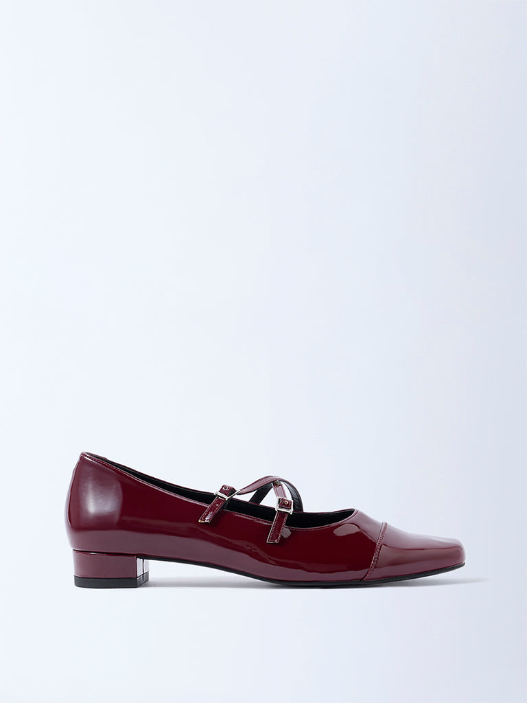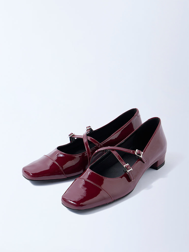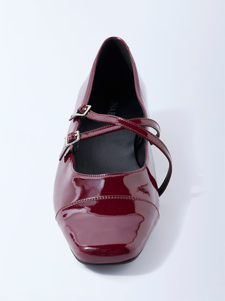 Add a sophisticated edge to your footwear rotation with these burgundy Mary Jane shoes from Luna Blu. Crafted in a glossy patent finish. the pair features a square toe and dual strap detailing with metallic buckles for a polished update to a timeless silhouette. Designed with a low block heel and cushioned insole. they deliver both comfort and elegance. making them perfect for workdays and after-hours alike.