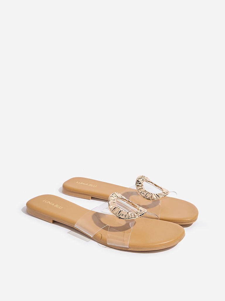 These stylish slides by Luna Blu feature a clear vinyl strap upper with a chic cut-out design. accented by a round textured gold-tone hardware detail. The soft insole and durable outsole ensure lasting comfort with every step.