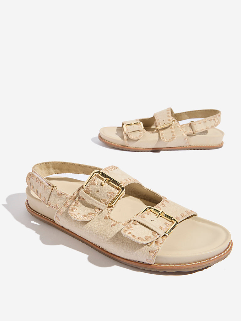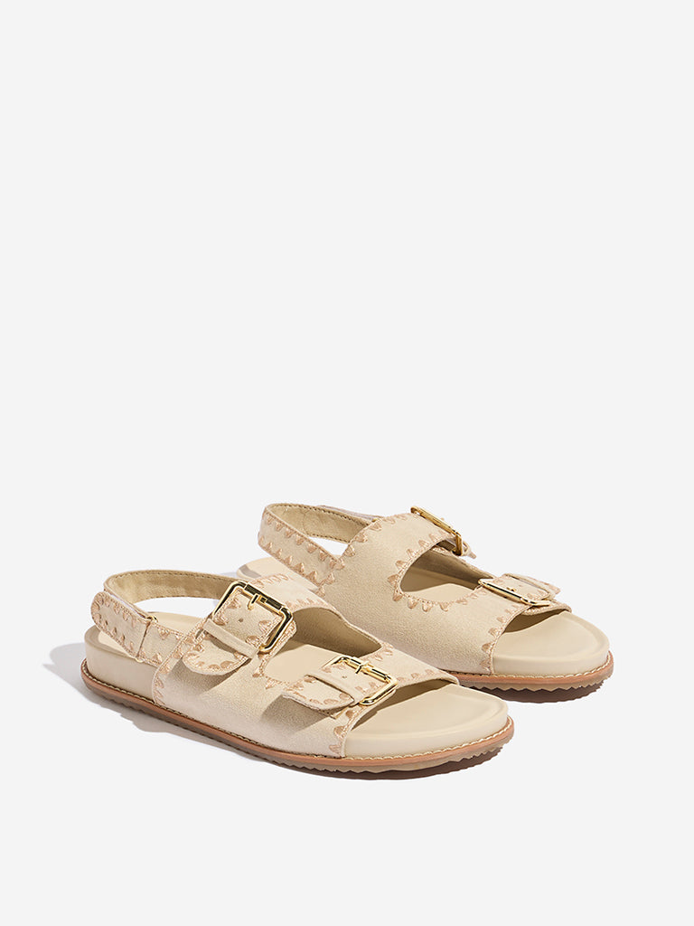 These cream sandals by Luna Blue feature minimal embroidery. It is designed with a double belted upper and buckled-addition. The footwear offers a secured fit with velcro-detailing at the back. They are designed with a soft insole. thick midsole and textured outsole for a comfortable walking experience.