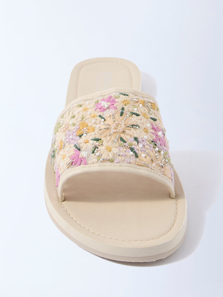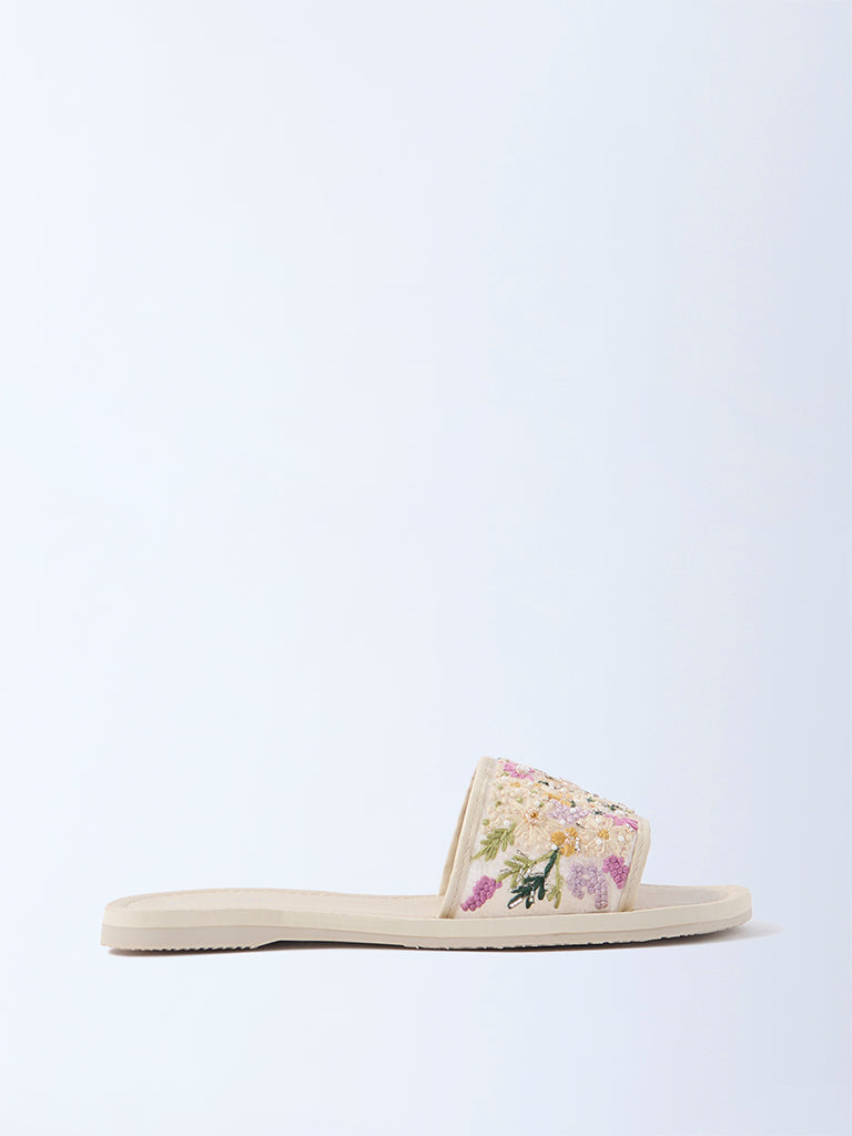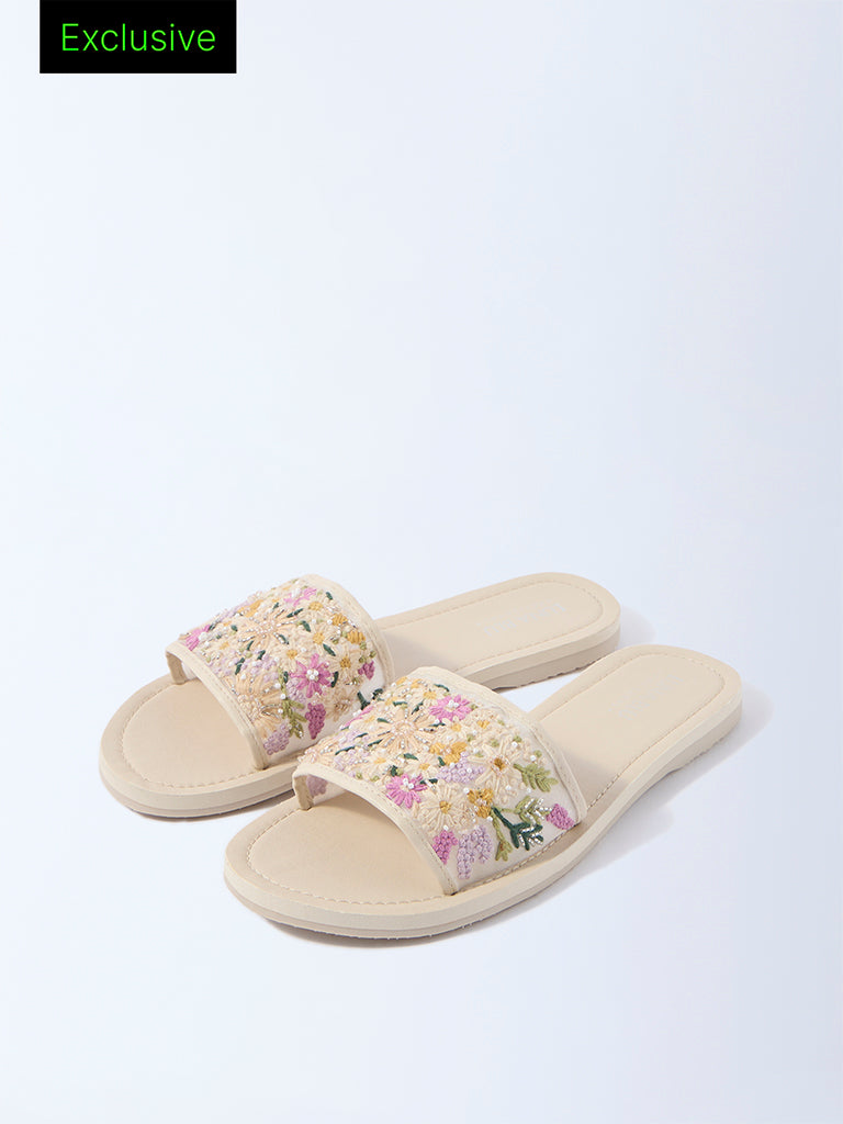 Infuse feminine charm into your warm-weather edit with these cream slides from Luna Blu. styled in a flat open-toe silhouette. The wide strap takes centre stage with delicate floral embroidery in pastel hues. intricately embellished with beads and pearls for a subtle sparkle. Balanced on a clean cream base. this pair effortlessly blends everyday comfort with artisanal detailing.