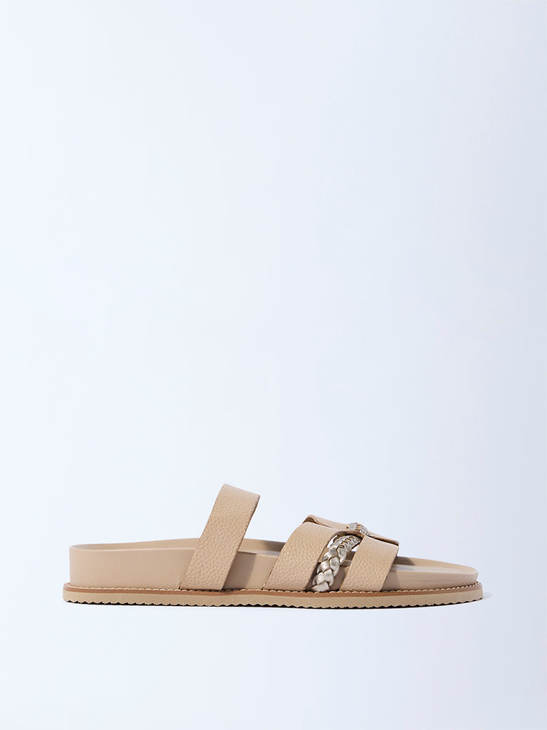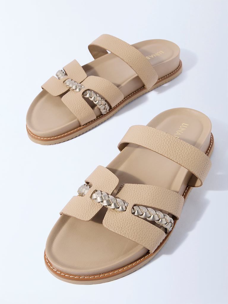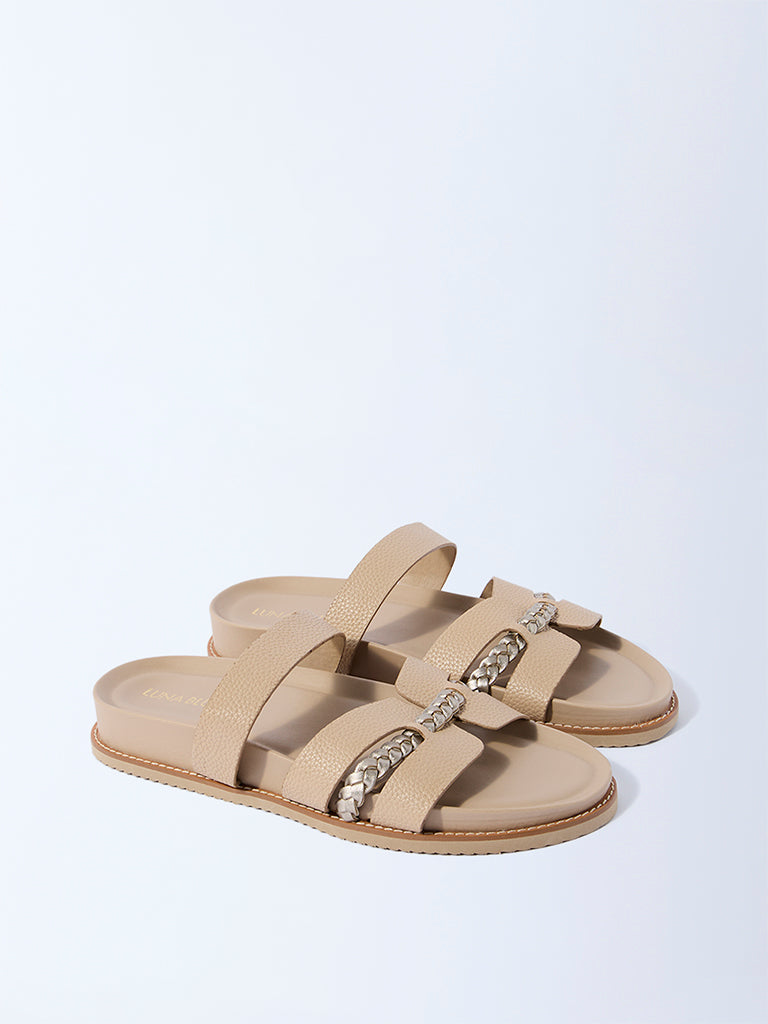 Perfect for warm-weather styling. these cream slip-on sandals from Luna Blu feature a refined two-strap silhouette. The front strap is adorned with an elegant braided detail. while the second remains sleek and minimal to create visual harmony. A soft insole offers lasting comfort. while the textured outsole ensures dependable grip.