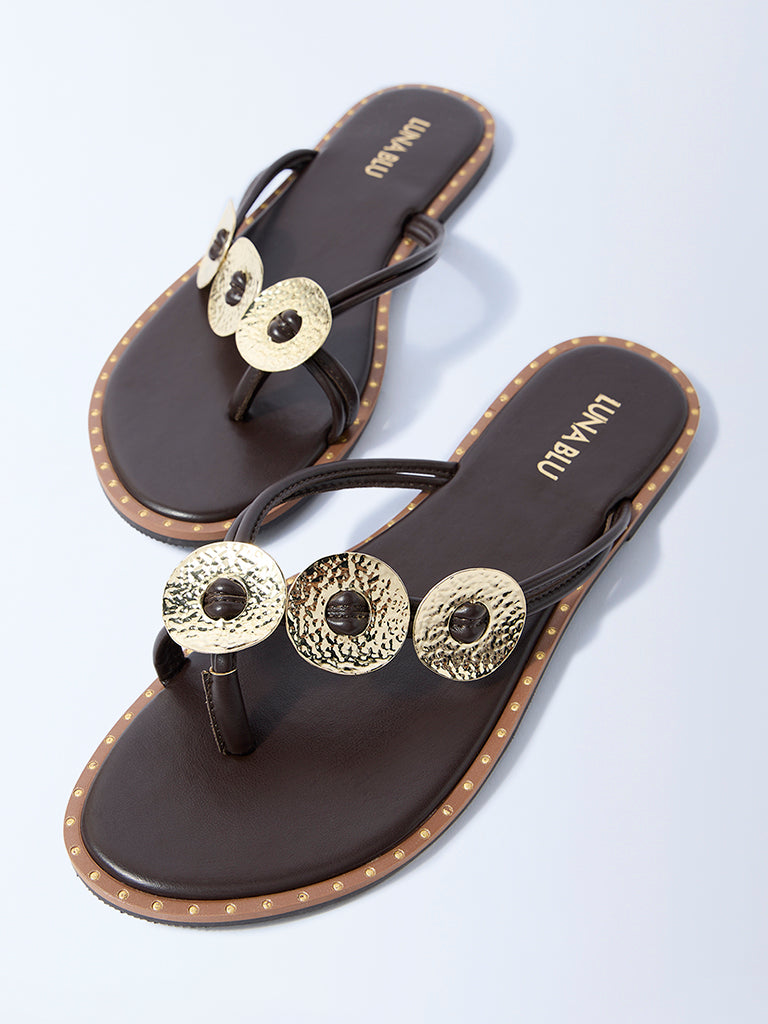 These dark brown flip-flops from Luna Blu bring festive shine to everyday style. Hammered gold-tone discs add subtle glamour. while the toe-loop silhouette and stud-detailed trim give the pair a modern finish. Comfortable yet statement-worthy. they’re an easy upgrade for both casual and occasion looks.