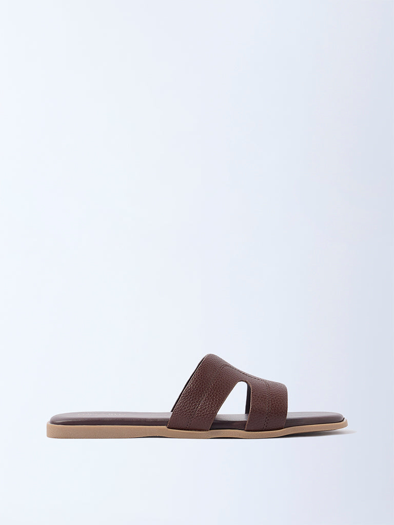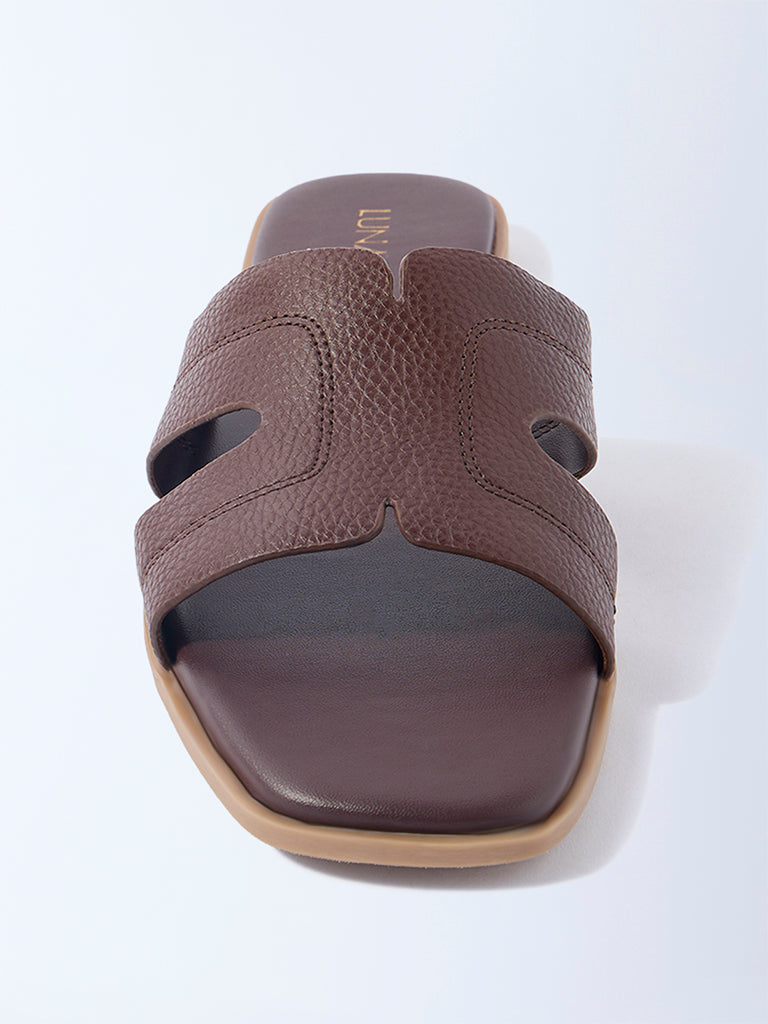 Keep it classic with these dark brown slides from Luna Blu. Designed with a geometric H-strap in a textured finish. they sit on a flat sole with a subtle contrast outsole for modern polish. Minimal yet refined. this versatile pair is perfect for everyday styling through the warmer months.