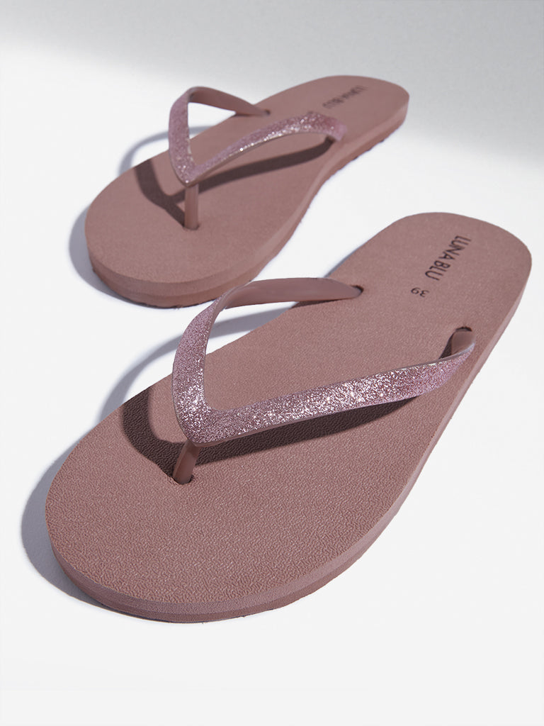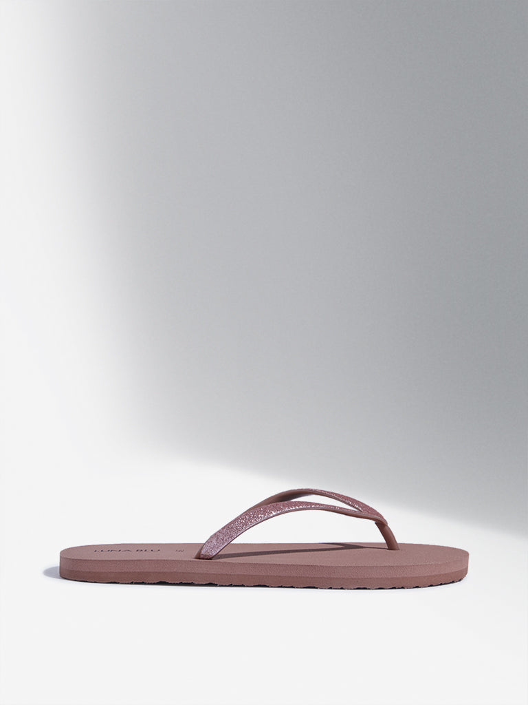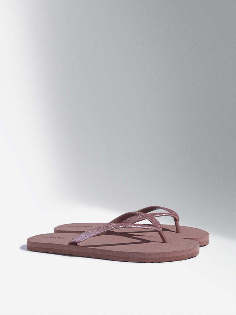 Adorned with shimmering thong straps. a smooth footbed. and ridged outsoles for traction. these dusty pink flip-flops from Luna Blu seamlessly blend style and comfort for your sunny escapades.