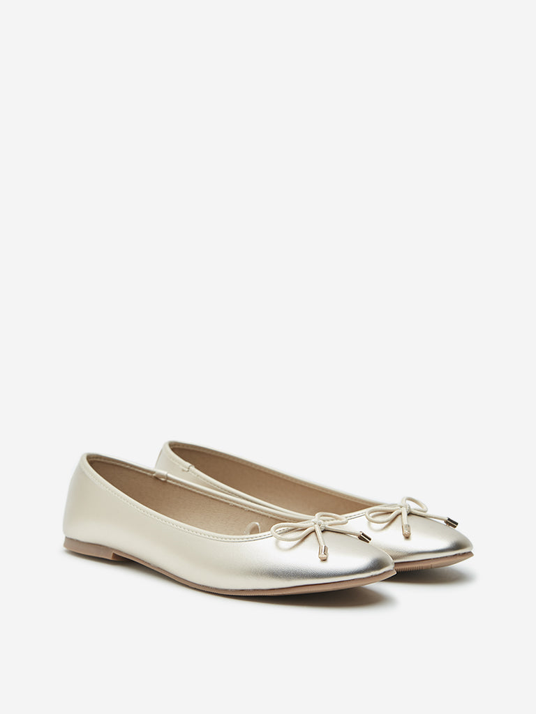 Luna Blu brings you these golden ballerina to add a touch of whimsy to any outfit. The charming bow on the round vamp elevates its look. The soft insole provides exceptional comfort. while the durable outsole ensures lasting wear. Perfect for both casual and dressy occasions.