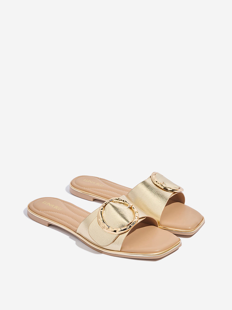 Make a statement with these gold slides by Luna Blu. Featuring a wide strap topped with a gold-toned buckle. they shine with a luxe finish. The sleek square-toe silhouette adds modern edge. making them a standout choice for day-to-night dressing with a hint of glamour.