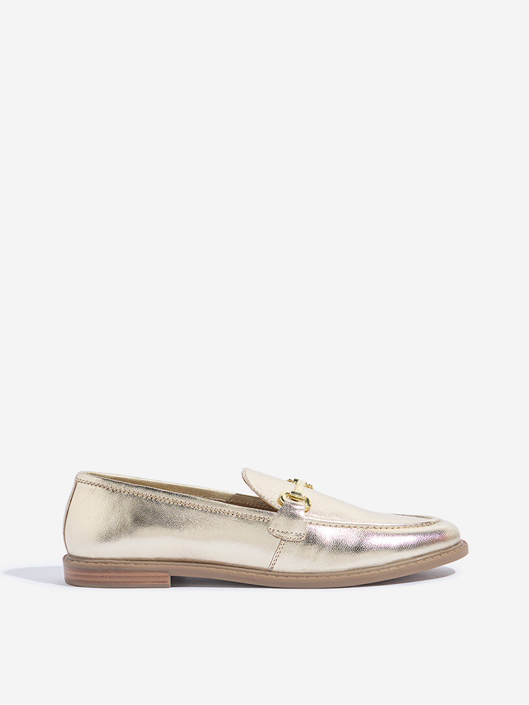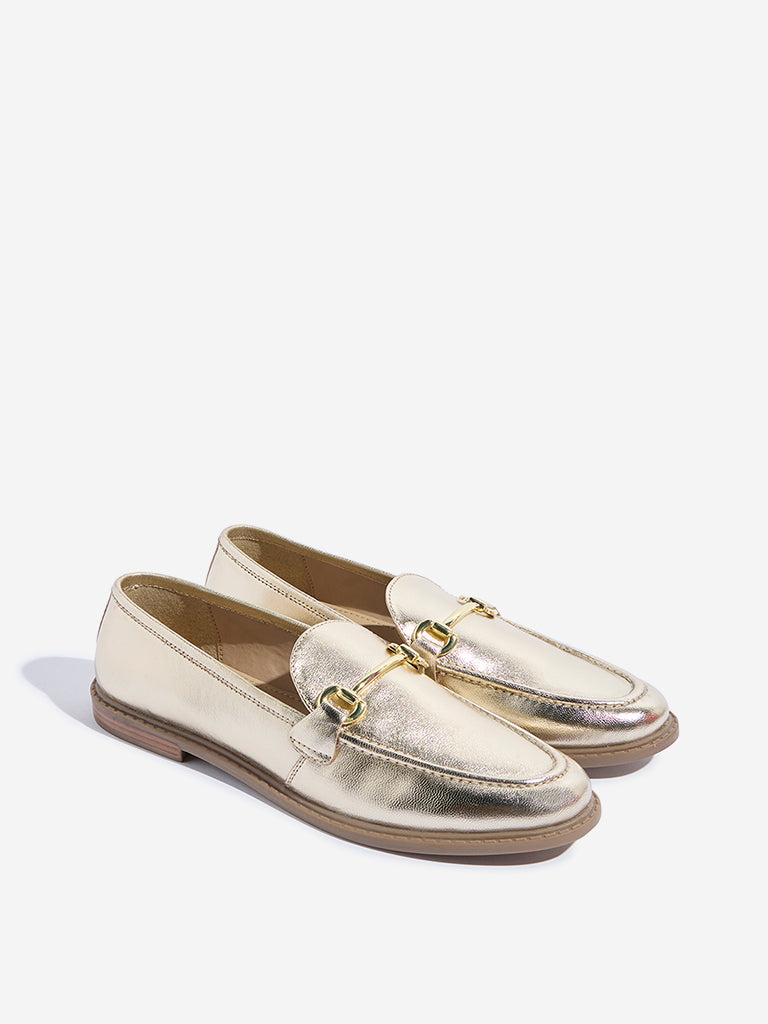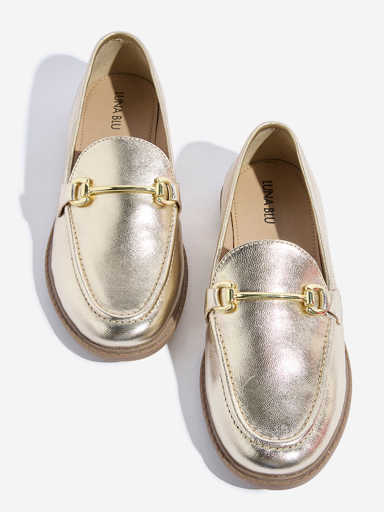 Introduce style in ever step with these gold loafers from Luna Blu. Accentuating a hardware detailing on the vamp for added chicness. these glossy shoes come fitted with a cushioned footbed and textured outsole for a comfortable walking experience.