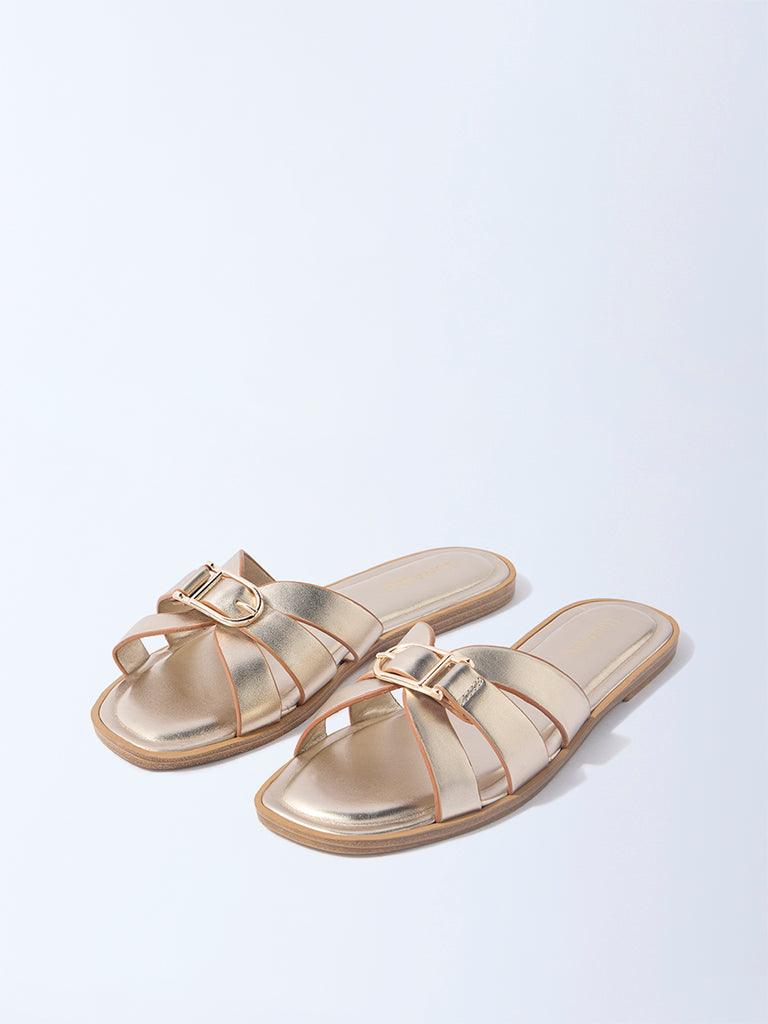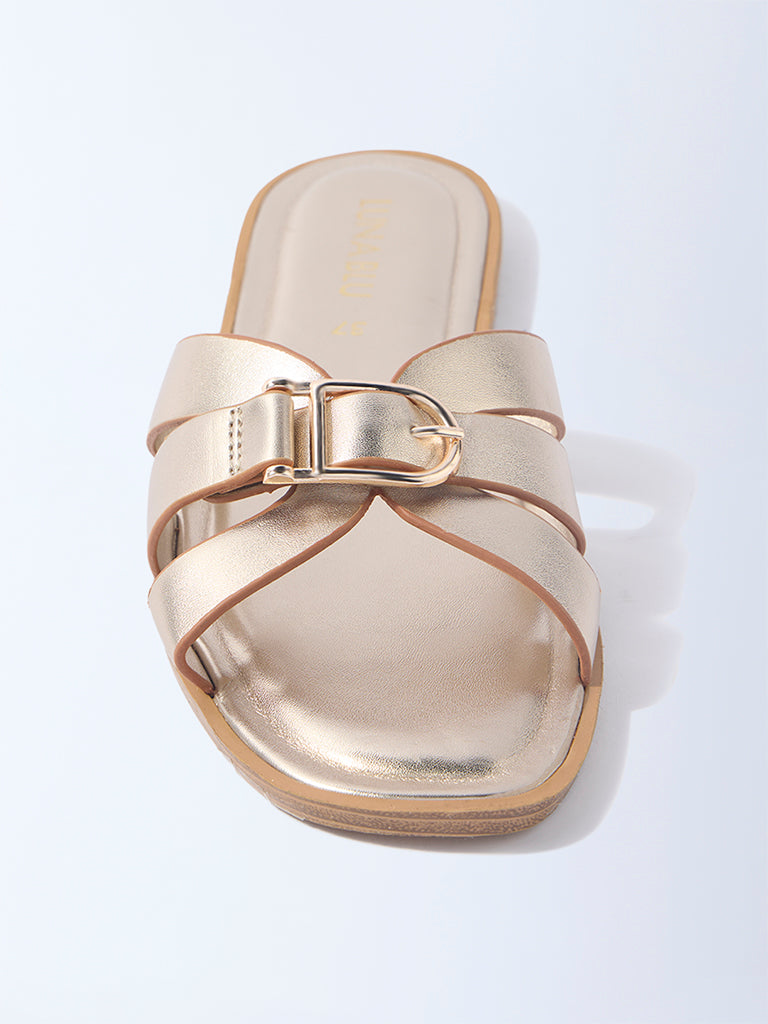 These stylish gold slides by Luna Blu are designed for both comfort and flair. The multi-strap upper is accented with a central buckle for a touch of detail. while a contemporary square toe adds a modern look. A padded insole and textured outsole ensure a comfortable and secure stride.
