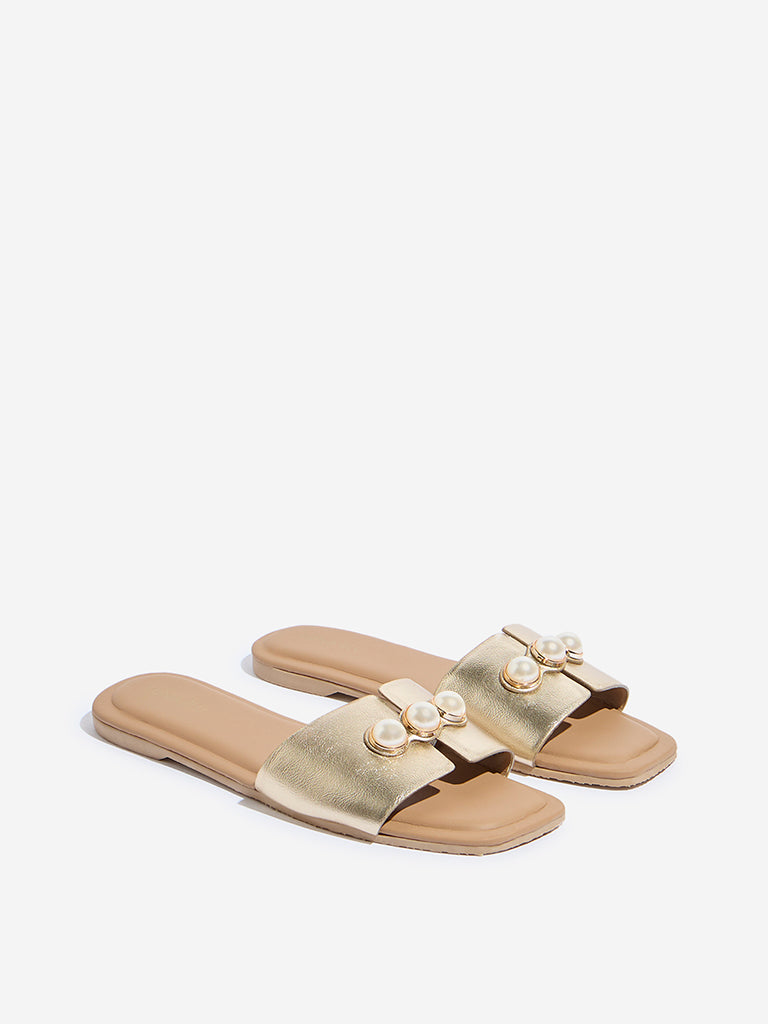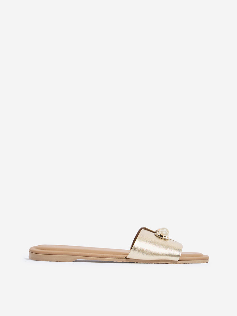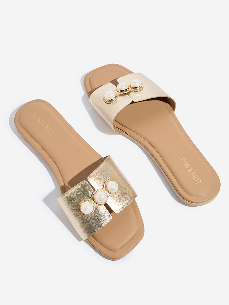 Luna Blu presents these gold slides featuring a pearlescent-detailed upper for a touch of elegance. Designed with a soft insole and textured outsole. they ensure comfort and style with every step.