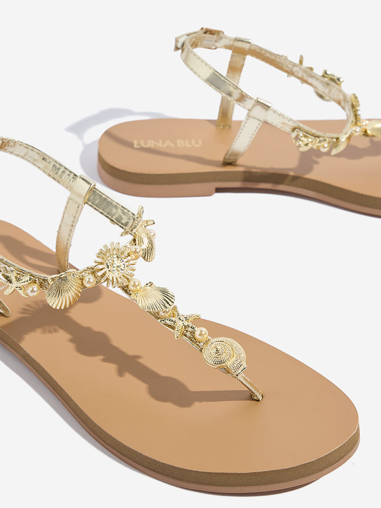 These gold sandals from Luna Blu are fashioned with elegant thong straps that cross over the foot. embellished with delicate shell details for a coastal-inspired charm. The padded insole offers all-day comfort. while the textured outsole ensures a steady grip.