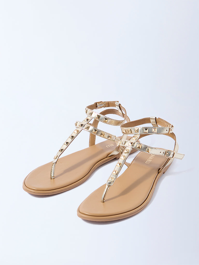 Striking and contemporary. these gold gladiator sandals from Luna Blu feature slim metallic straps adorned with pyramid studs for a bold edge. Designed with a T-strap silhouette. ankle buckle fastening. and a cushioned sole. they combine comfort with statement style. perfect for dressing up casual and evening outfits alike.