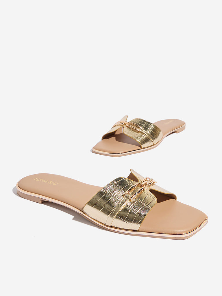 Step into a world of elegance and sophistication with Luna Blu’s gold textured slides. The beautifully textured upper. adorned with gold-toned metal detailing. elevates your style. while the soft insole and quality outsole promise all-day comfort with every step.