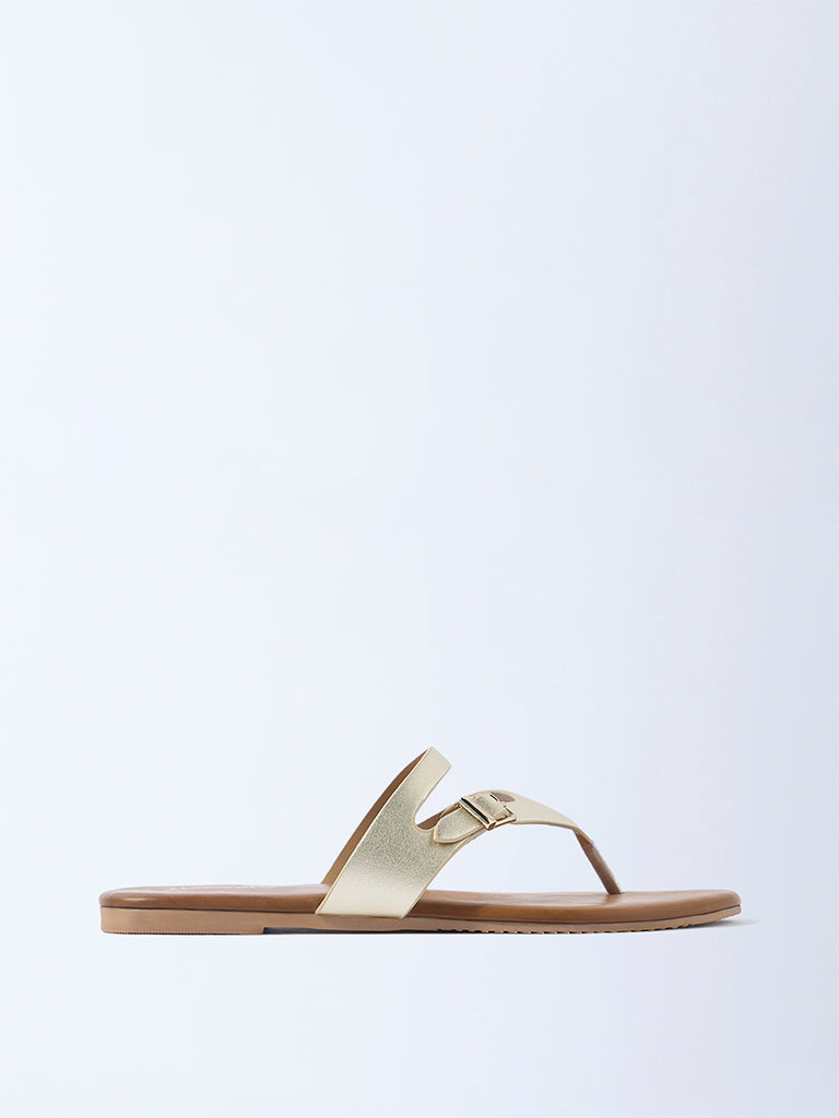 Lend your look a modern edge with these gold thong-strap sandals from Luna Blu. Elevated with sleek buckle detailing. they reimagine a classic silhouette with contemporary finesse. Designed with a flat sole and cushioned comfort. they transition seamlessly from casual daytime plans to festive evenings—effortless style in every step.