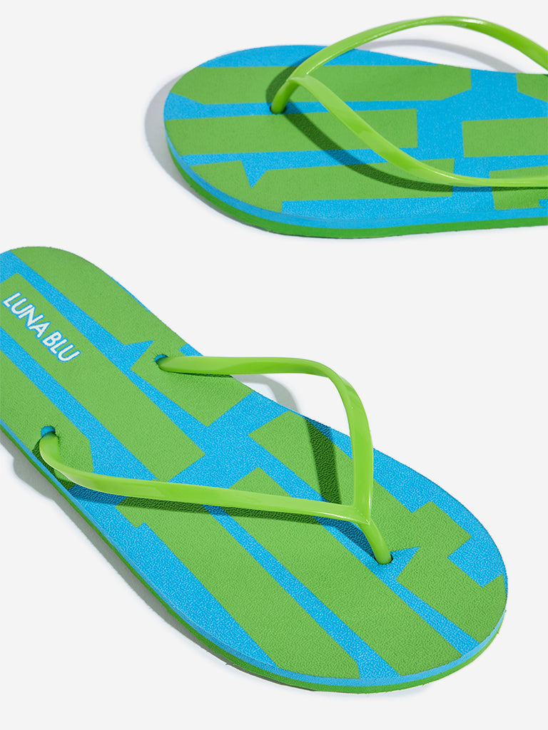 Luna Blu presents these green flip-flops. designed to make a bold statement with every step. Featuring a vibrant abstract print on the insole. these flip-flops are perfect for adding a splash of colour to your casual look. The Y-shaped strap ensures a secure fit. while the textured outsole provides stability and comfort. Ideal for easy-going days. whether you’re headed to the beach or running errands. these flip-flops offer the perfect mix of style and practicality.