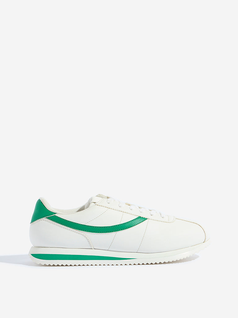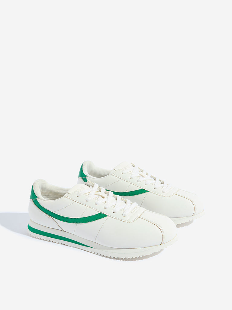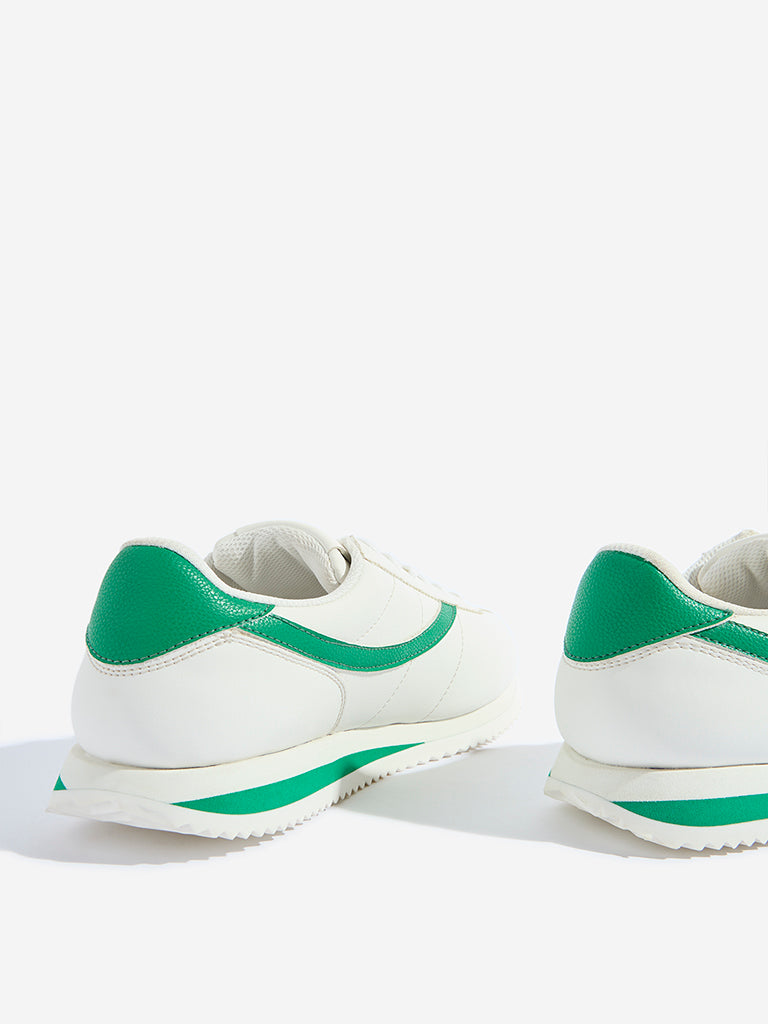 These white sneakers from Luna Blu effortlessly blend classic design with a sporty twist. The sleek upper is accented with green accents along the side stripes. heel tab. and laces. Featuring a cushioned insole for comfort and a textured outsole for enhanced traction. they offer a perfect mix of style and practicality.