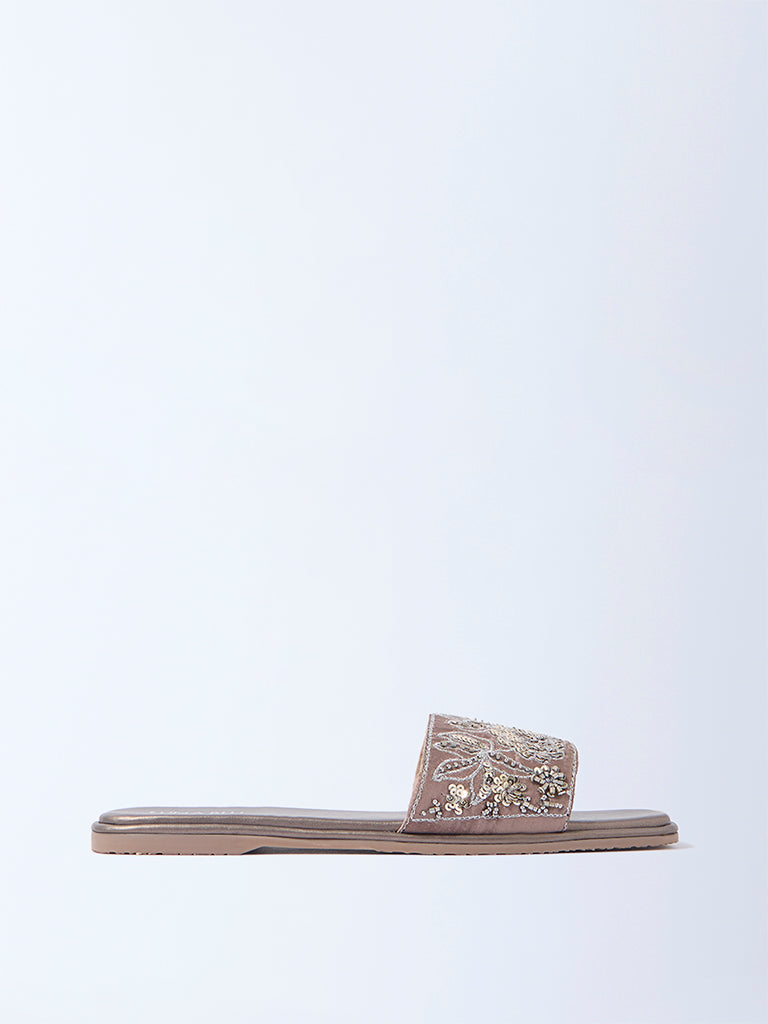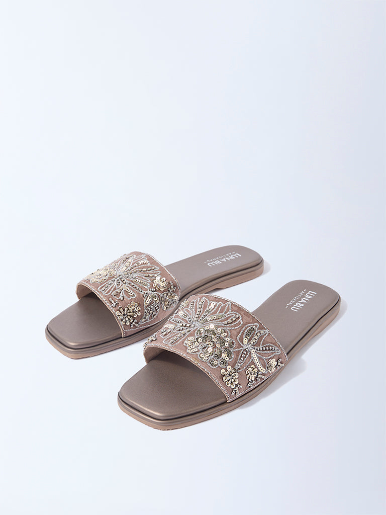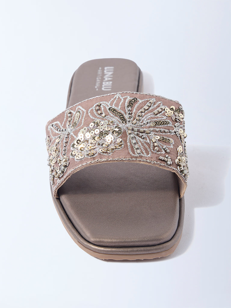 Add instant sparkle to your festive looks with these grey slides from Luna Blu. The sequin-embellished wide strap captures attention while the open-toe silhouette rests on a padded footbed for all-day comfort. A textured outsole ensures steady steps. making this pair perfect for adding a touch of glamour to special occasions.