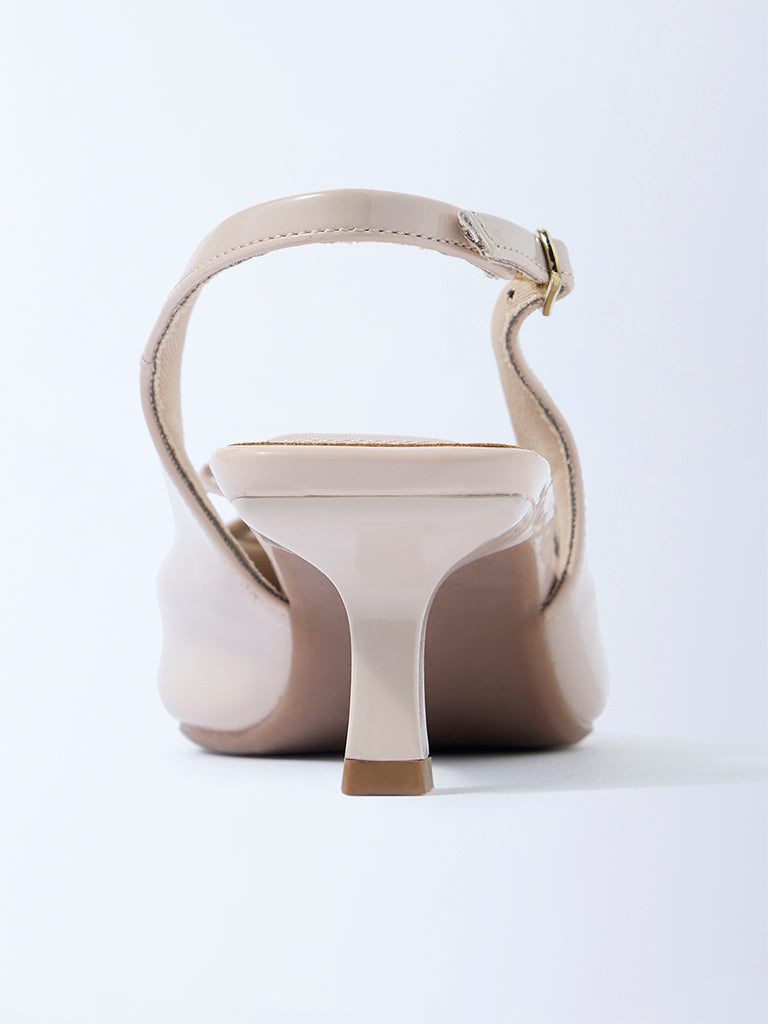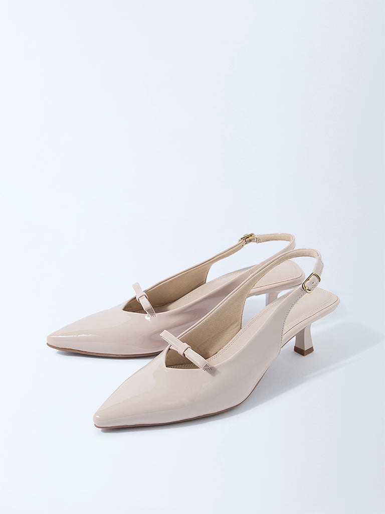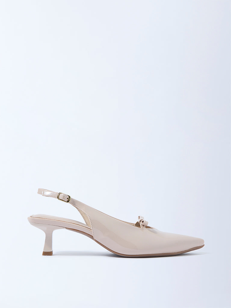 These ivory mules from Luna Blu is elegantly shaped with a pointed toe and a slingback strap secured by a slender buckle fastening. The upper is highlighted with a neat bow detail. adding subtle refinement to the silhouette. Resting on a mid-height heel. the design is completed with a padded footbed that ensures comfort and a textured outsole for a dependable grip. making it a graceful choice for elevated occasions.