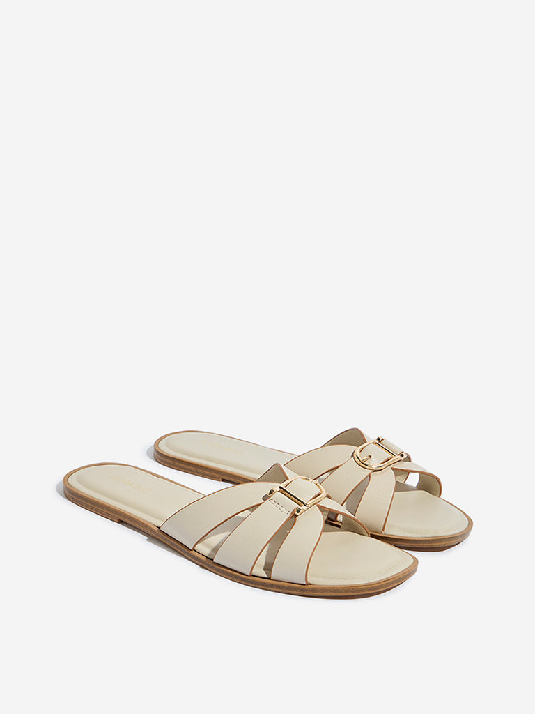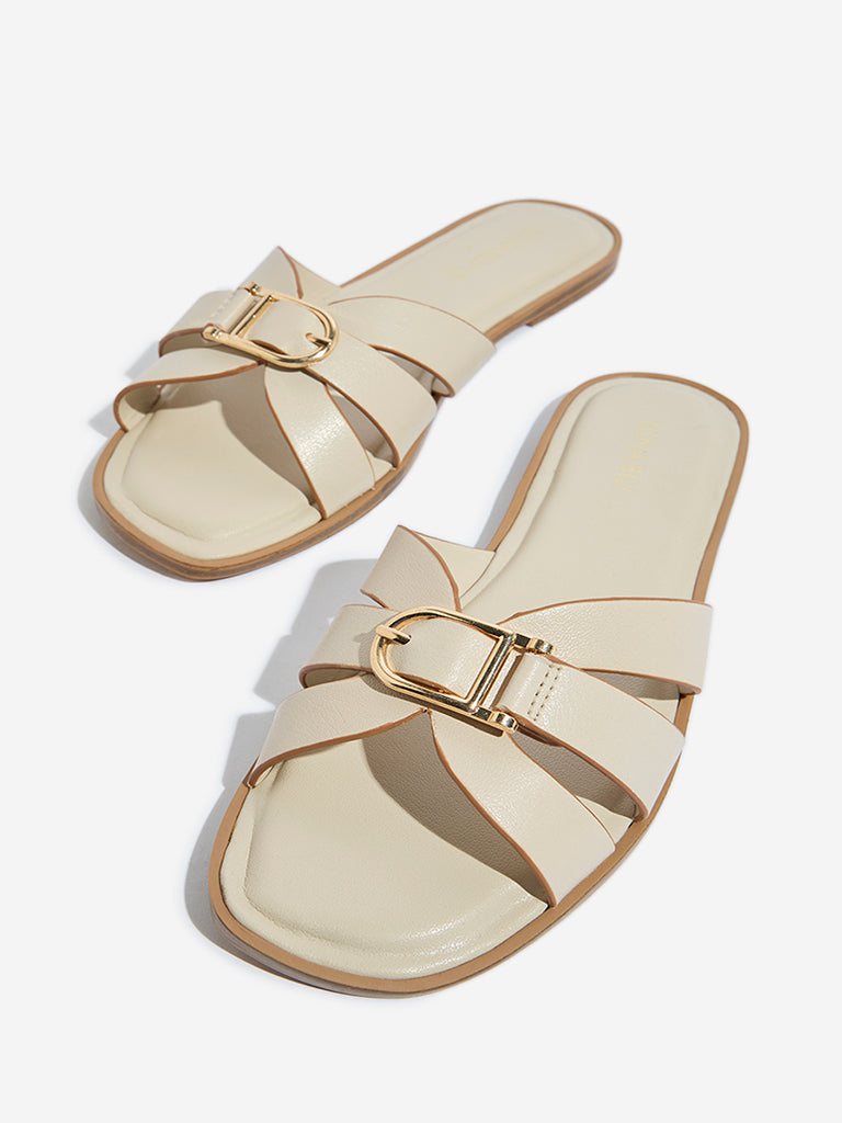 Luna Blu introduces these ivory slides. featuring a sleek criss cross upper with a sophisticated gold-accent buckle. Designed with a soft insole and textured outsole. they offer a perfect blend of comfort and effortless style for everyday wear.