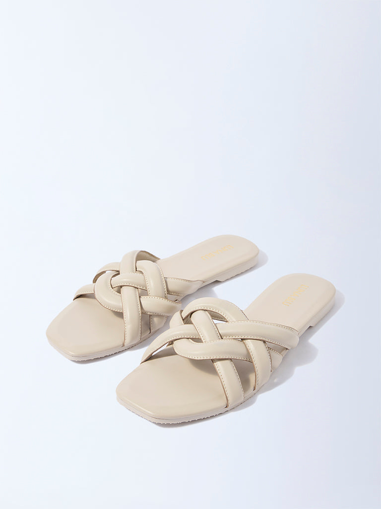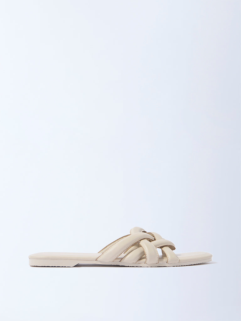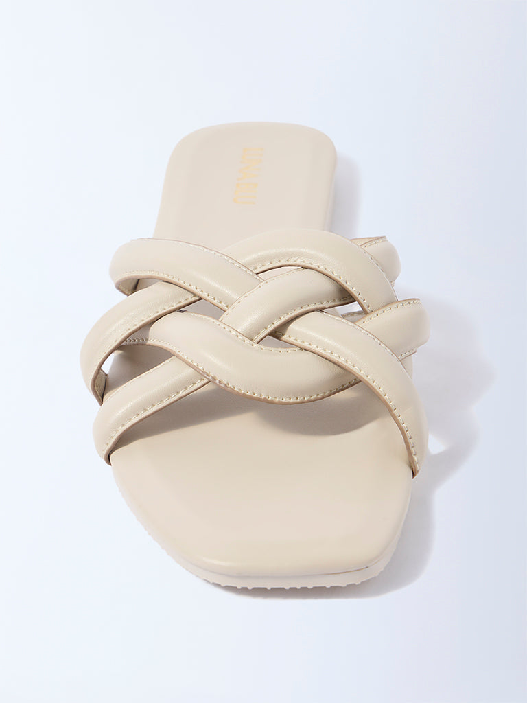 Let your feet do the talking in these ivory slides from Luna Blu. Interwoven criss-cross straps form a chic knotted design. giving the silhouette a sculptural edge. The square-toe base rests on a flat sole. with a padded footbed ensuring all-day comfort and a textured outsole providing reliable traction.