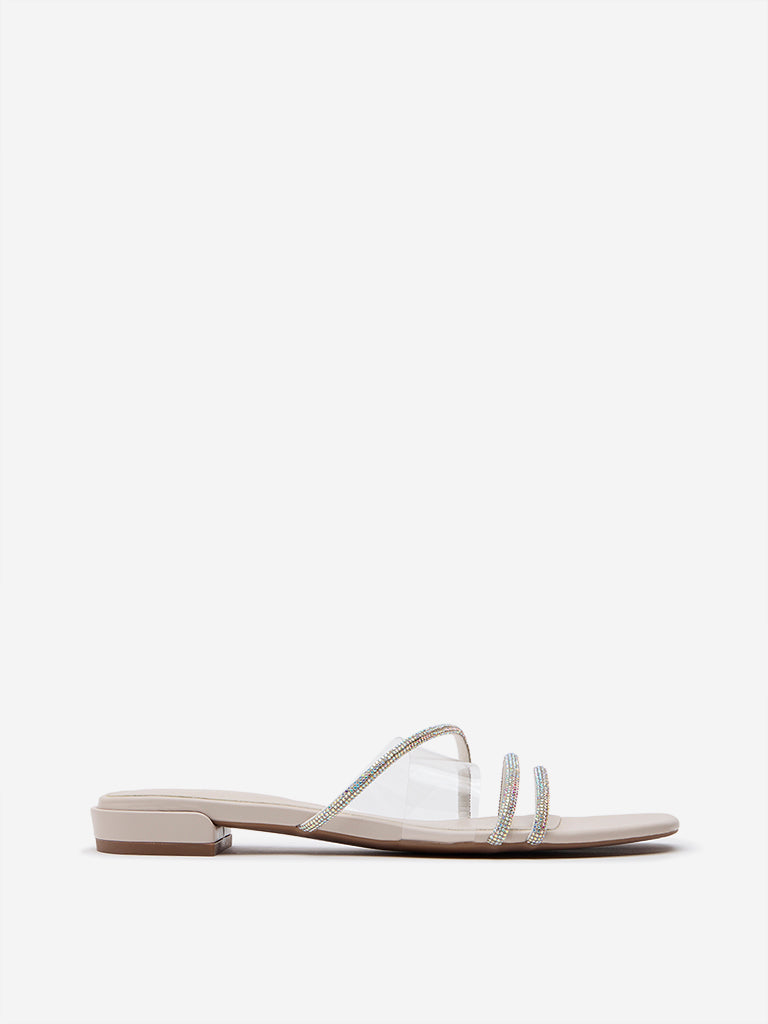 Step up your style with the Luna Blu’s ivory slides. featuring a chic diamante-detailed multi strap design with vinyl accents. Complete with a soft footbed and sturdy outsole. these slides offer both elegance and comfort.