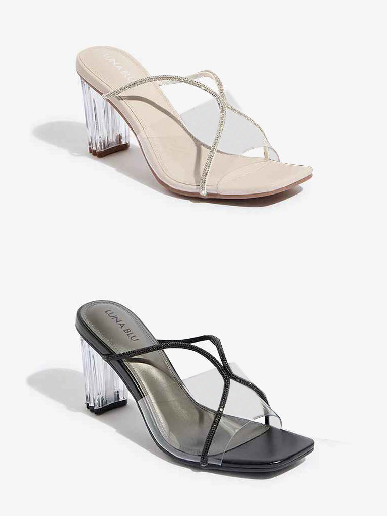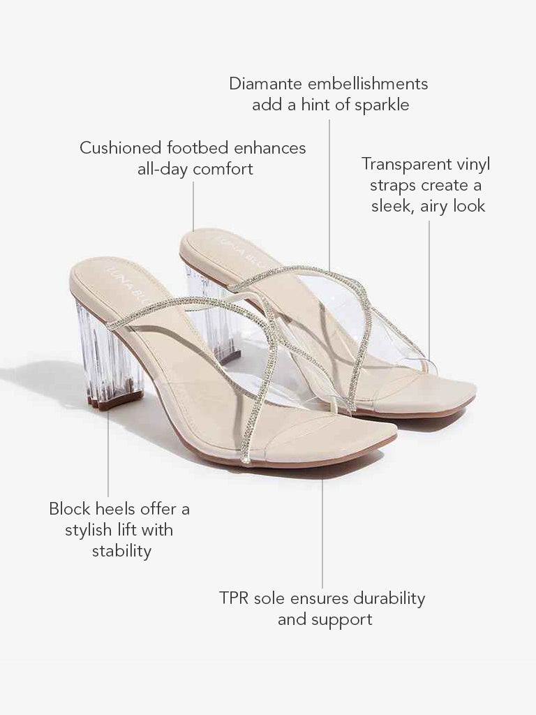 Luna Blu introduces these stunning ivory sandals. designed with a modern touch of glamour. The sandals feature block heels that provide both height and comfort. making them ideal for day-to-night wear. The vinyl straps elegantly frame the foot. while the delicate diamante embellishments add a touch of sparkle and sophistication.