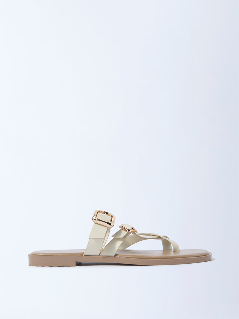 These ivory slides from Luna Blu showcase criss-cross thong straps accented with dual metallic buckles for a sleek. modern look. The square-toe design is set on a padded insole that ensures comfort through the day. Finished with a ridged outsole that offers steady grip. this pair combines understated style with everyday versatility.