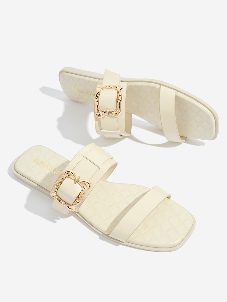 These ivory slides from Luna Blu showcase a sleek dual-strap design. highlighted by a gold-toned textured buckle that adds both security and style. Featuring a cushioned padded insole and a textured outsole. this pair effortlessly combines modern refinement with all-day comfort to elevate any outfit.