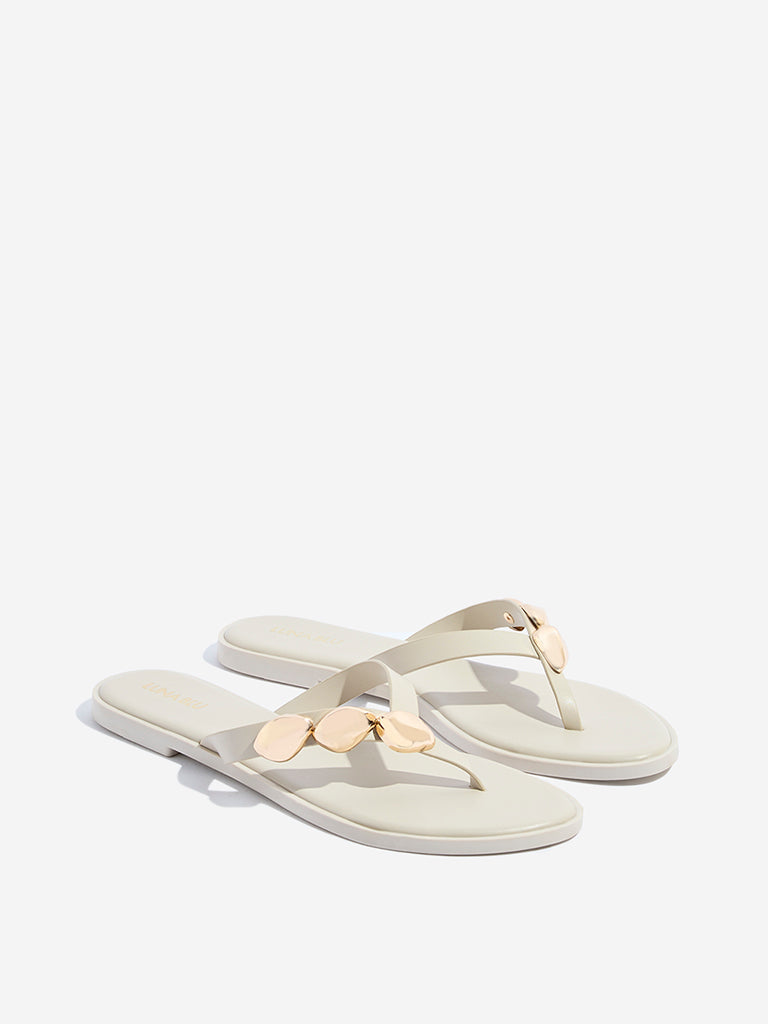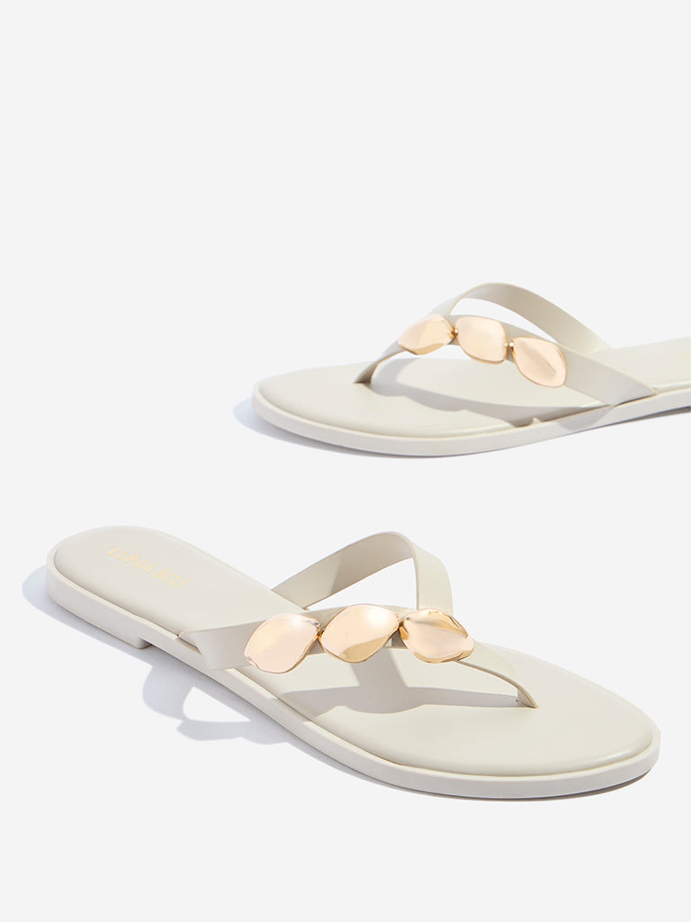 These ivory flip-flops from Luna Blu channel a breezy sophistication. The muted hue sets a clean canvas for the fluid. gold-toned embellishments that shimmer subtly with every step. Built on a classic thong base. they’re finished with a cushioned footbed and textured outsole to keep comfort at the core of your stride.