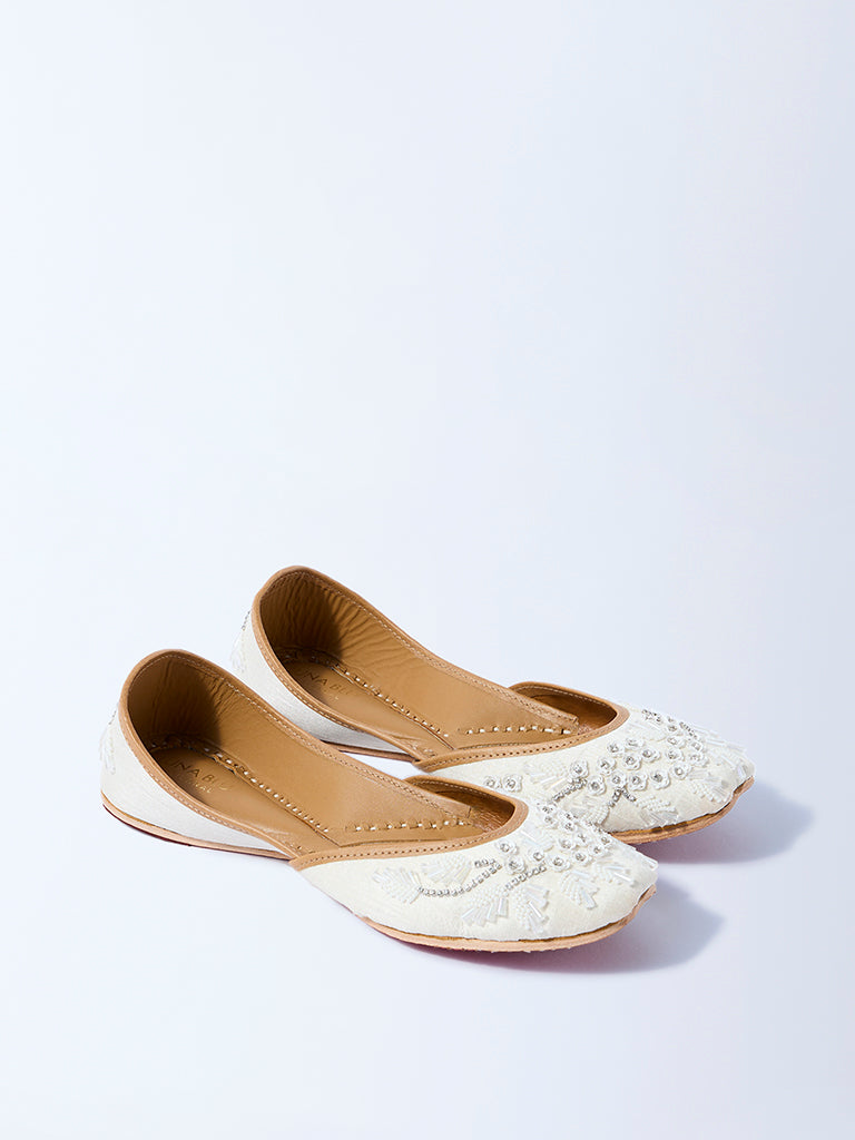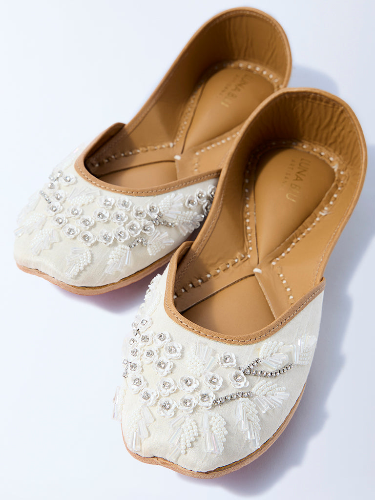 These ivory juttis from Luna Blu blend traditional craftsmanship with modern elegance. Embellished with tonal beads. pearls and sequins. the floral motifs add depth and a soft shimmer. Set on a cushioned tan sole with contrast stitching. they make an ideal pick for festive mornings. wedding ceremonies or intimate celebrations.