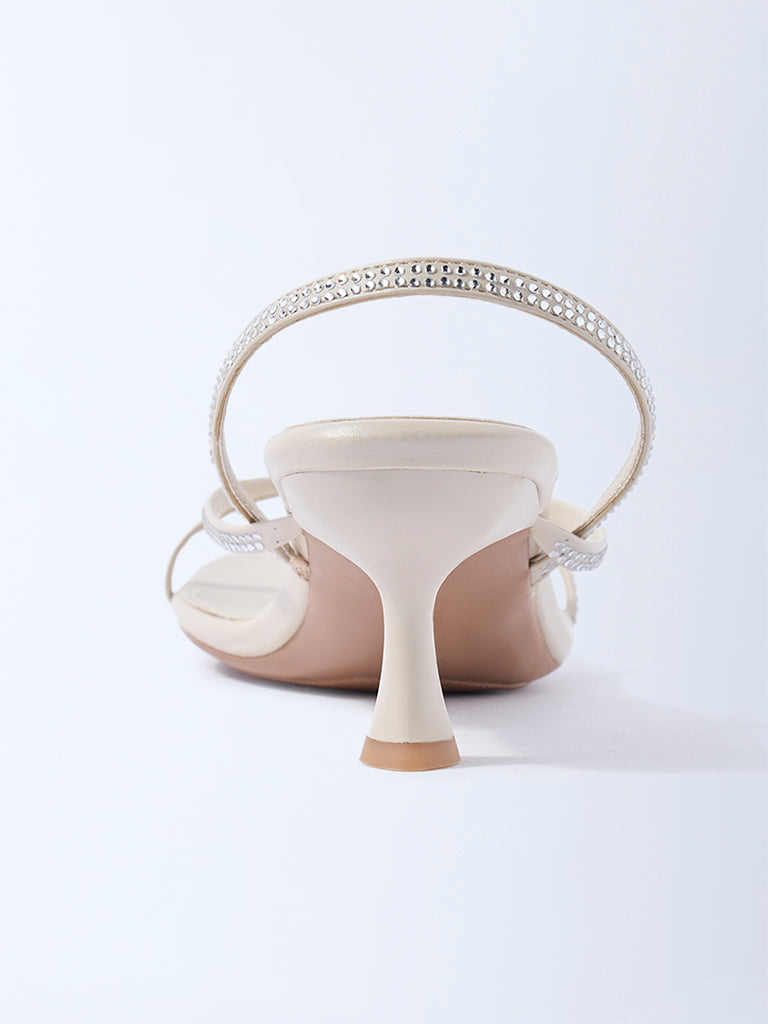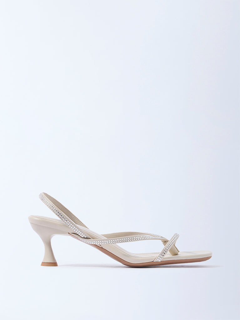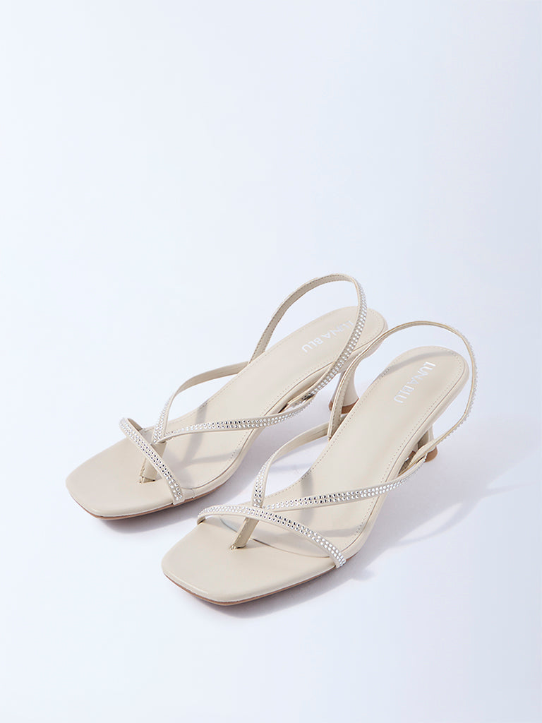 Add a hint of sparkle to your evening look with these ivory multistrip sandals from Luna Blu. Designed with slender straps embellished with diamante accents. they exude refined glamour. The flared heel and cushioned footbed offer comfort and poise. making them a chic choice for both festive and formal occasions.