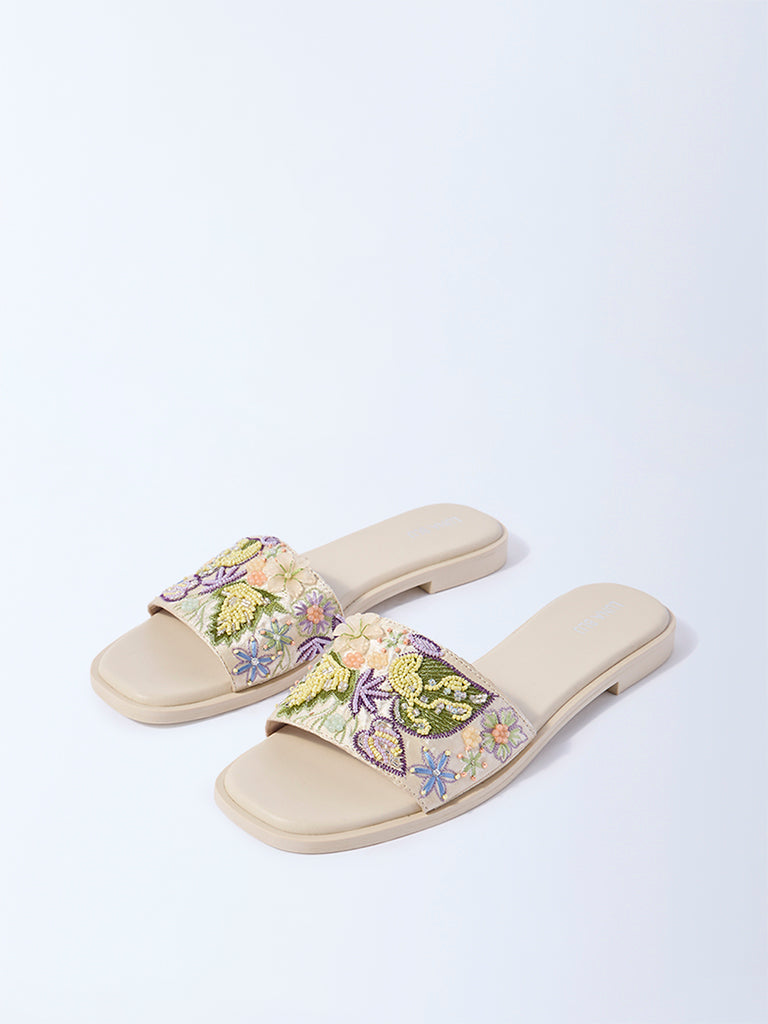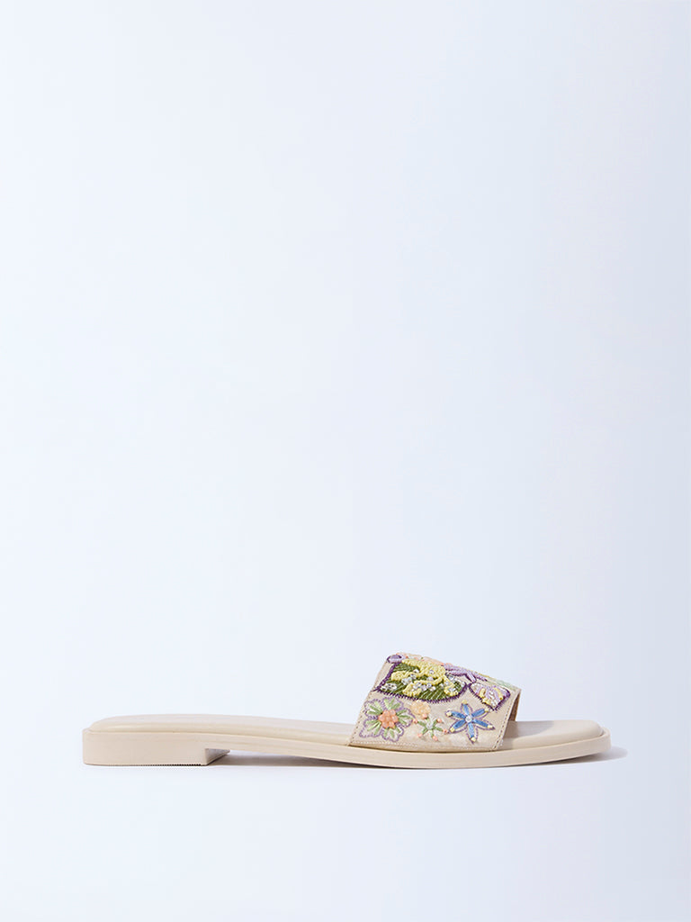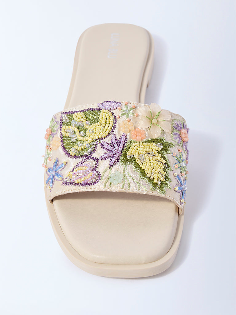 Add a touch of elegance to everyday dressing with these ivory slides from Luna Blu. Designed with a wide strap adorned in embellished floral embroidery. they strike the perfect balance of comfort and charm. A padded insole ensures ease with every step. while the flat outsole provides steady grip.