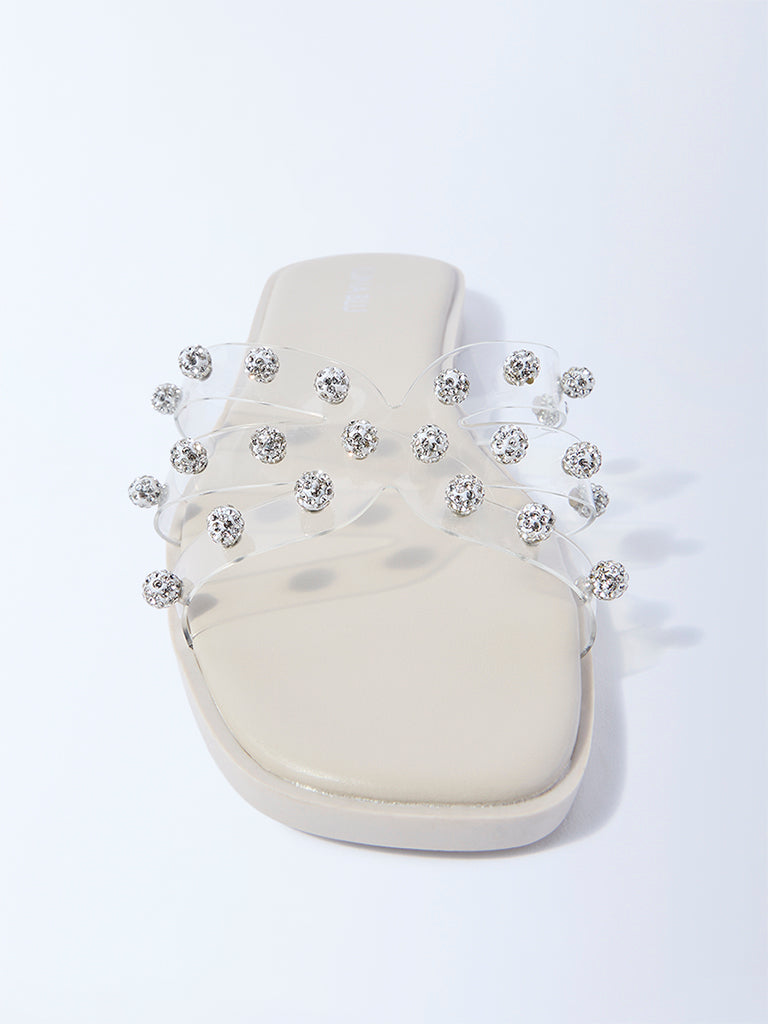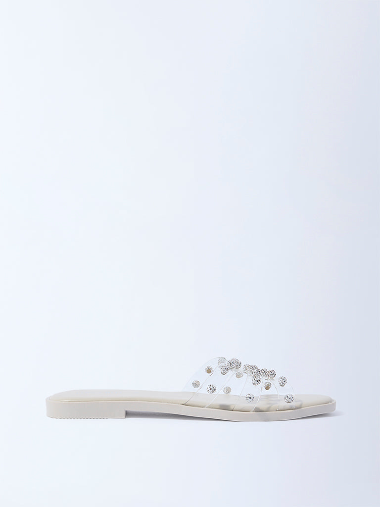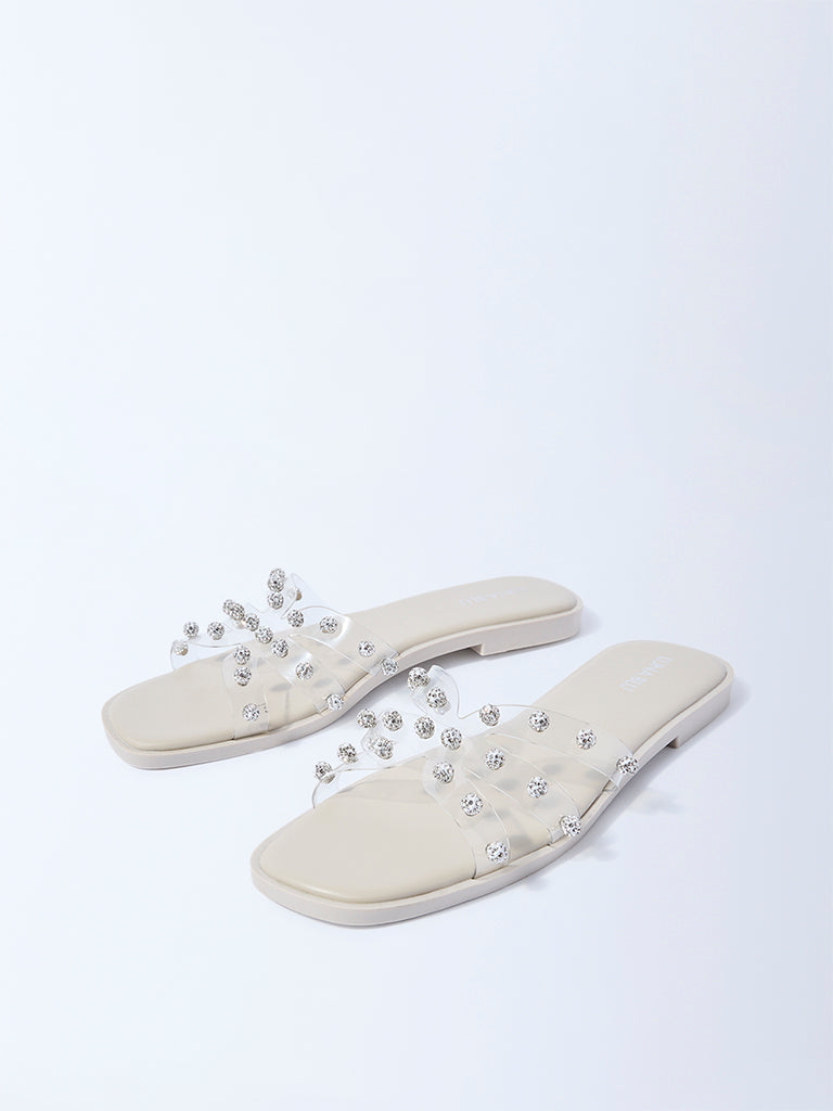 Add a touch of sparkle to your casual style with these ivory slides from Luna Blu. Designed with broad vinyl straps embellished with crystal-like accents. they bring effortless glamour to your daily edit. Set on a flat base with a cushioned footbed for day-long comfort. they’re finished with a textured outsole for steady steps.