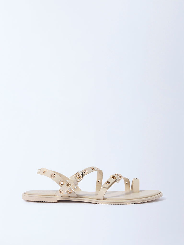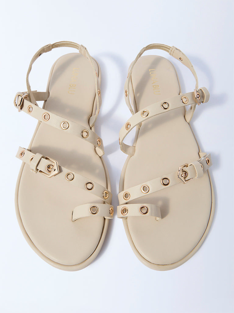 Lend a refined touch to your everyday edit with these ivory sandals from Luna Blu. Designed with wide crossover straps accented by metallic eyelets and a statement buckle. this pair blends structure with subtle shine. The toe-ring silhouette offers added support. while the cushioned footbed and textured outsole keep comfort and traction in check.