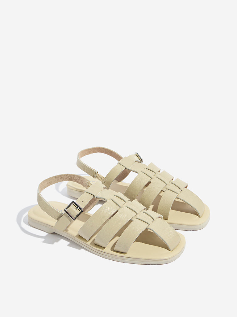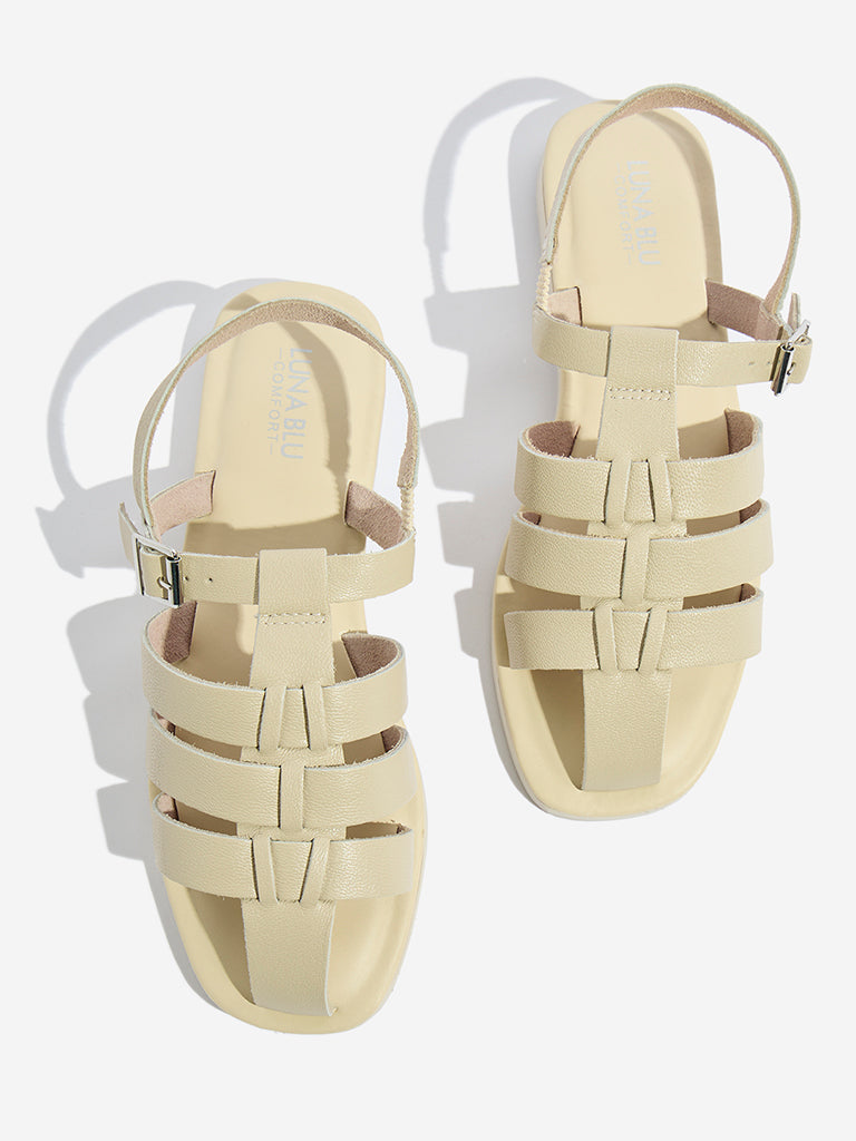 These ivory fisherman sandals from Luna Blu blend artisanal texture with everyday ease. Woven wide straps lend a handcrafted feel. while the gold-toned buckle at the ankle ensures an adjustable fit. Set on a cushioned footbed with a ridged outsole. this pair is built for comfort and grip.