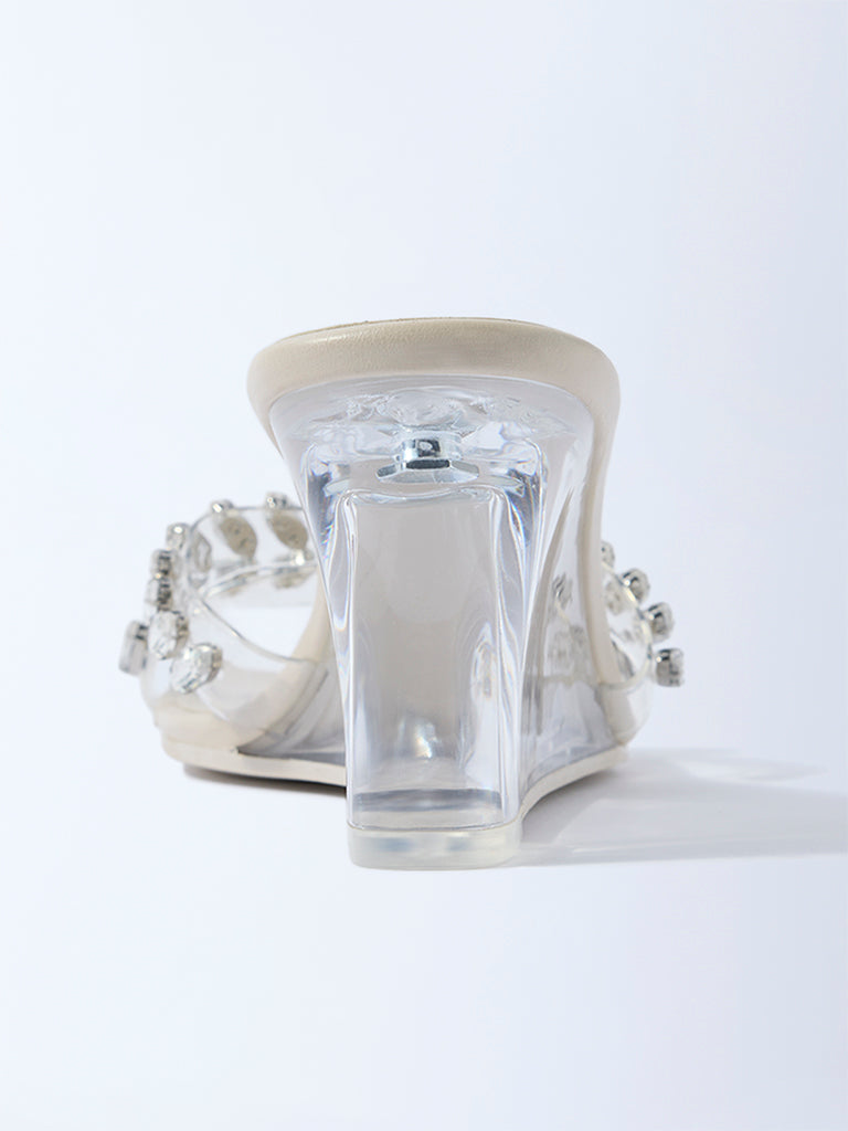 These ivory sandals from Luna Blu are crafted with vinyl straps detailed with faceted gemstones that add a hint of sparkle without overpowering the design. The clear wedge heel enhances the design. while the square-toe silhouette lends a modern edge. Finished with a soft footbed and a textured outsole. they are designed to take you from intimate celebrations to chic soir??es with ease.