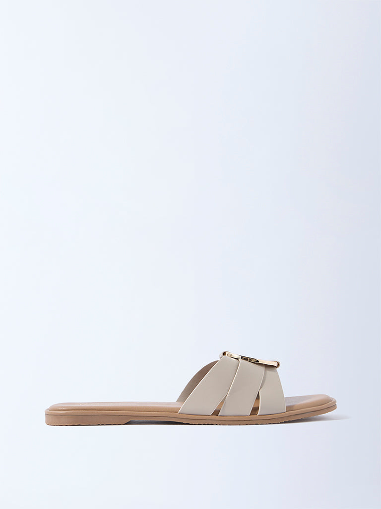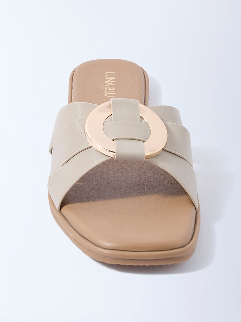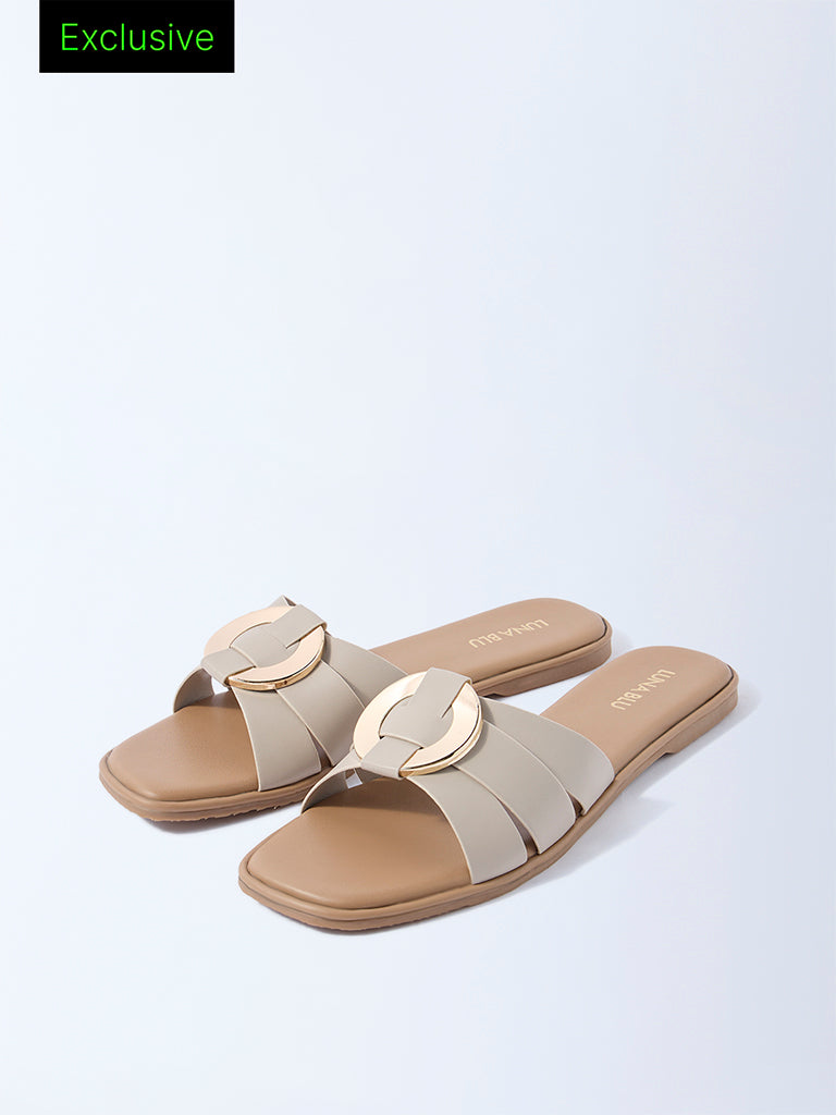 These ivory slides from Luna Blu are styled with interlaced multi-straps. centred with a polished gold-tone disc that adds a statement accent. Designed with a soft insole for comfort. they are completed with a textured outsole that ensures reliable grip. A sleek pair that lends a modern finish to everyday looks.