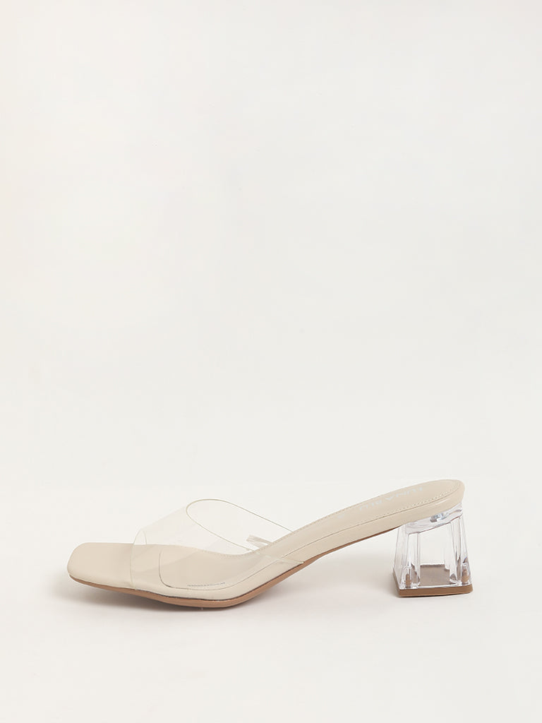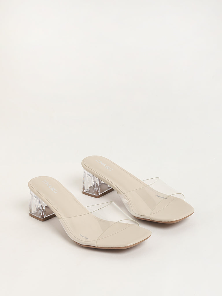 Fashion your feet with Luna Blu sandals. The stunning transparent block heels offer both height and stability. ensuring a confident stride. With one transparent strap. the sleek ivory design in vinyl material exudes elegance.