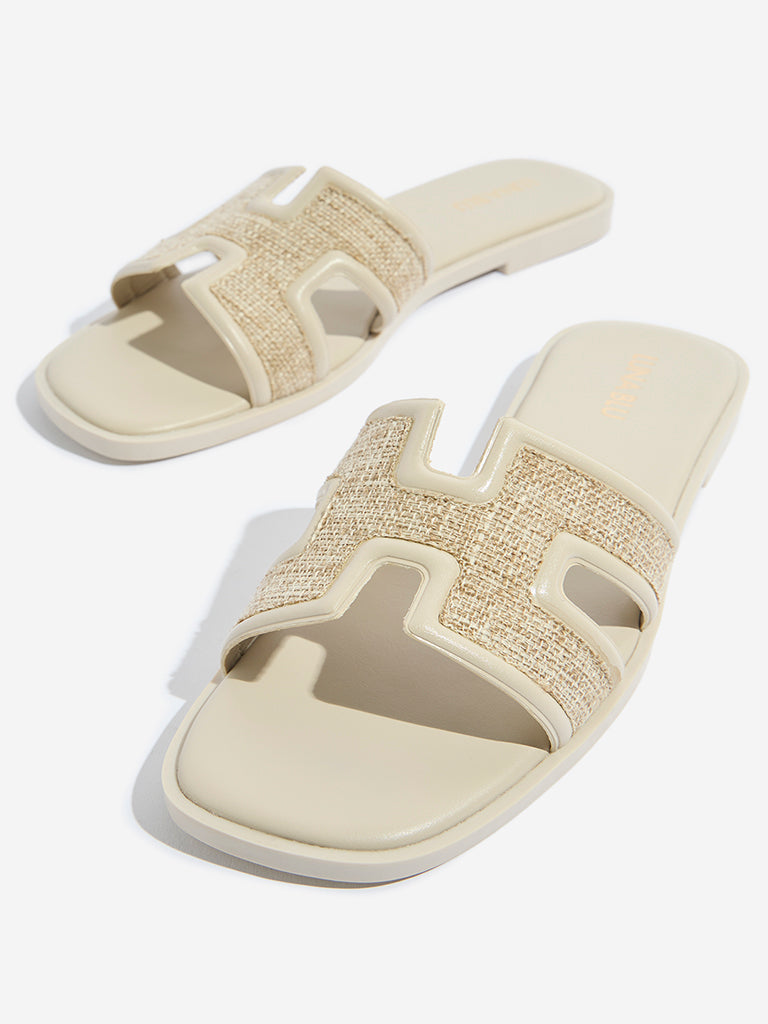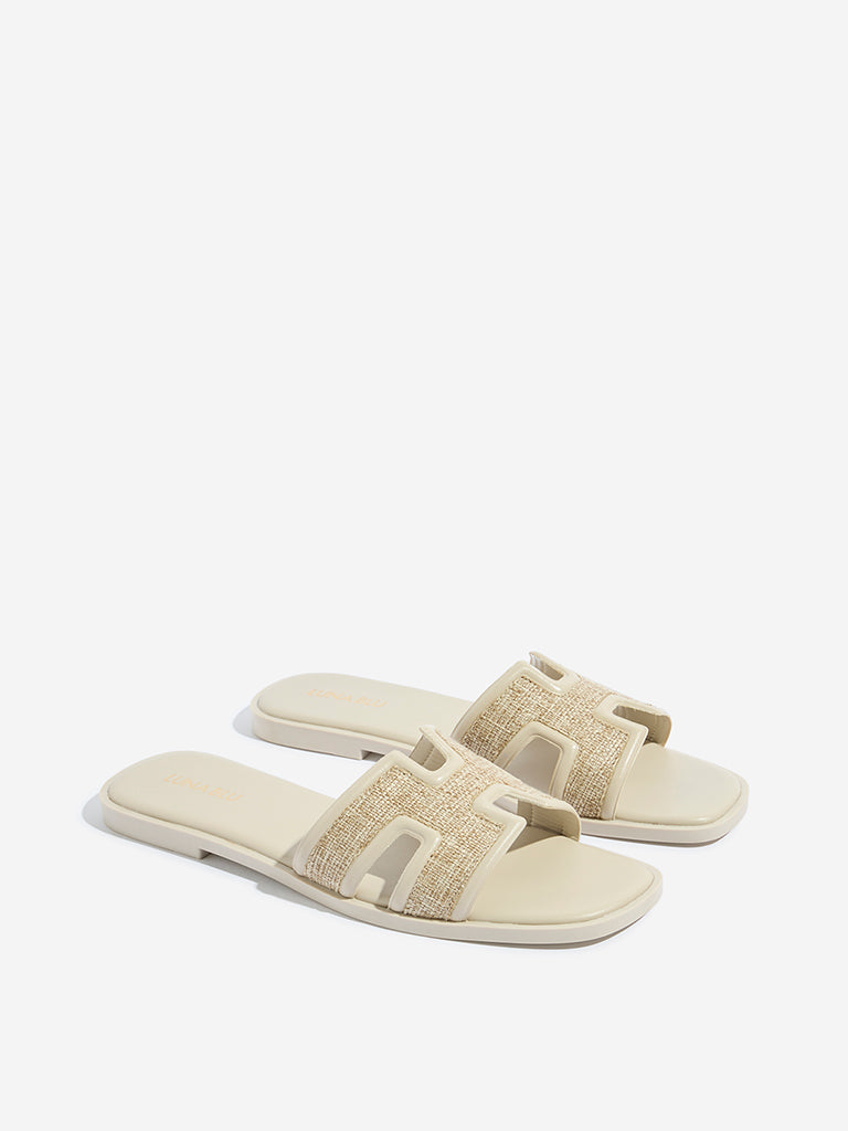 These ivory slides from Luna Blu are designed with an H-cut strap highlighting a woven jute-like texture. Built for comfort with a cushioned insole and a textured outsole for better grip. this refined pair is perfect for easy. everyday styling.