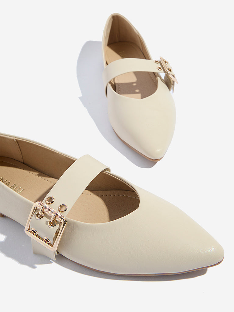 These ivory Mary Janes shoes from Luna Blu are fashioned with a sleek pointed toe for a polished silhouette. Featuring a gold-toned buckled strap for a refined finish. they’re designed with a soft insole for comfort and a textured outsole that ensures a steady grip.