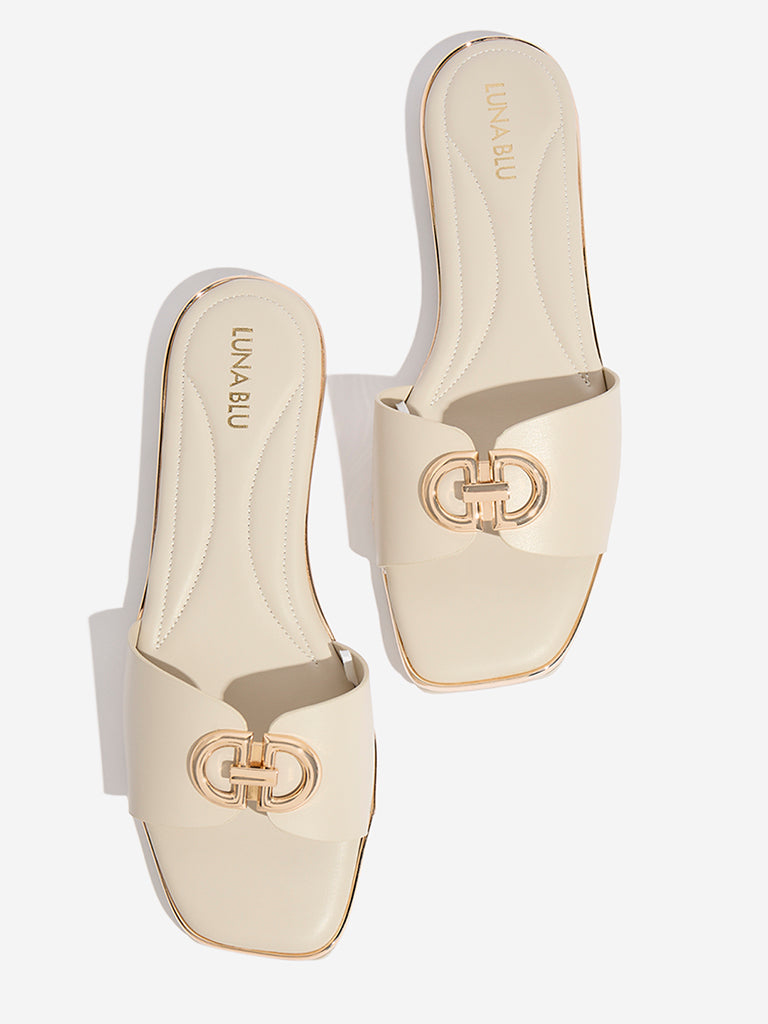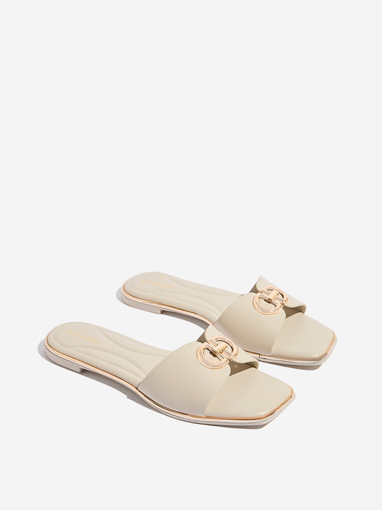 These ivory slides from Luna Blu exude effortless elegance with a broad strap accented by sleek metal detailing. Crafted from durable materials. they feature a cushioned footbed for lasting comfort and textured outsoles for a steady grip with every step.