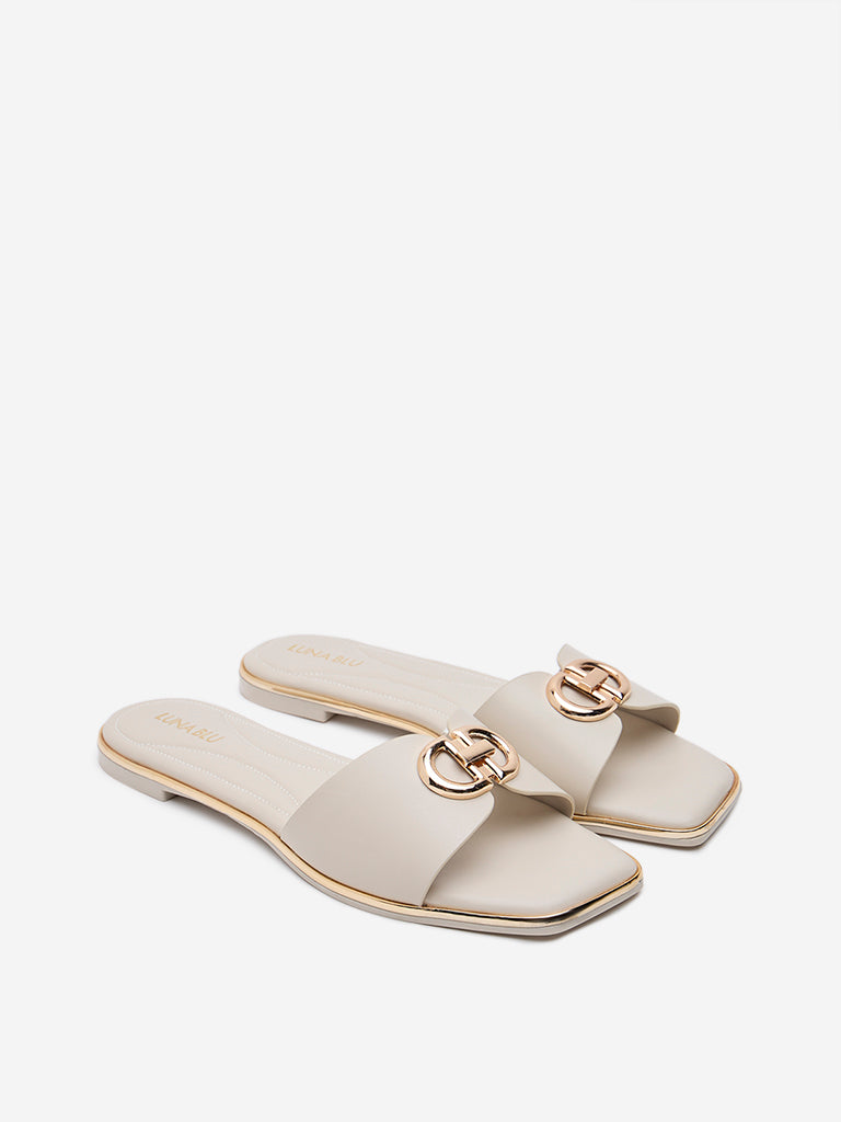 Luna Blue presents these ivory slides adorned with metal detailing on the upper. The stylish single band design perfectly complement the golden frame of these slides. Their soft insole and textured outsole give this footwear a complete finish.