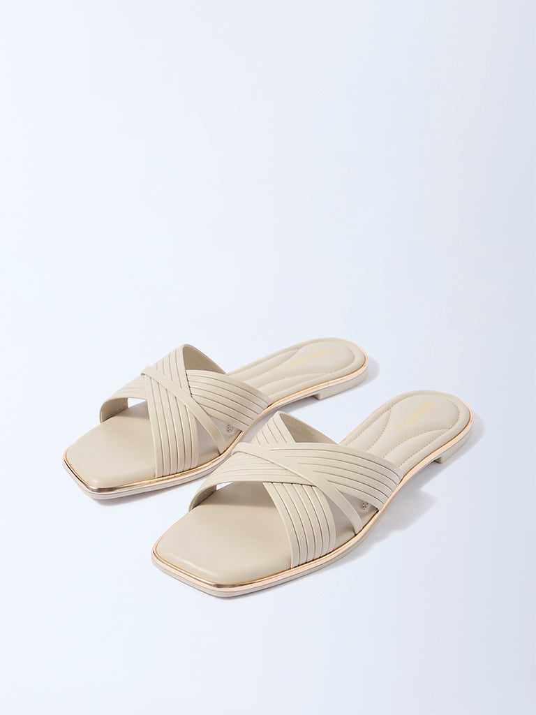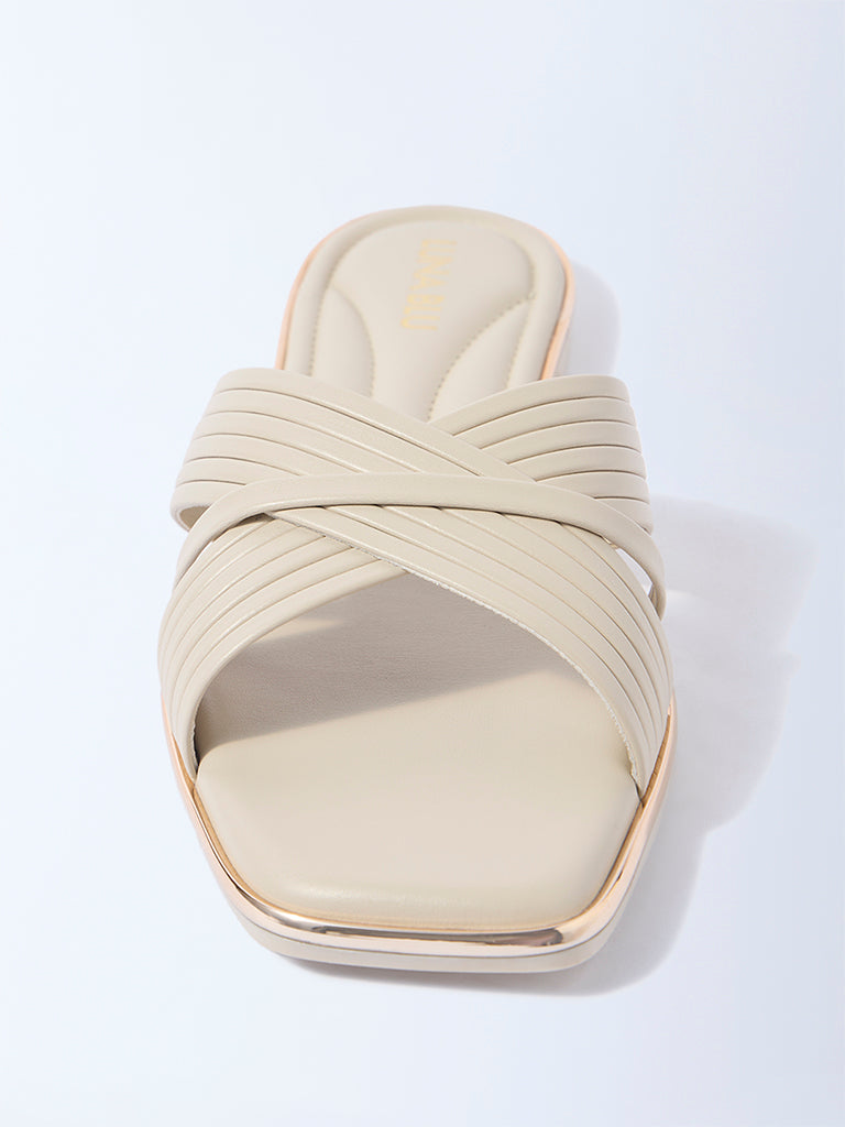 Glide through your day with understated sophistication in Luna Blu’s ivory slides. Sleek single straps layered with delicate metallic details catch the light for a refined shimmer. while a gently rounded square toe lends a modern edge. The cushioned footbed promises all-day ease. and the flat sole ensures effortless wearability.