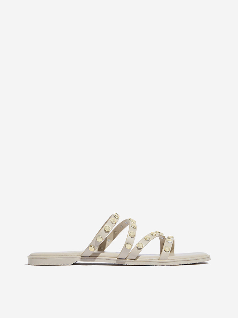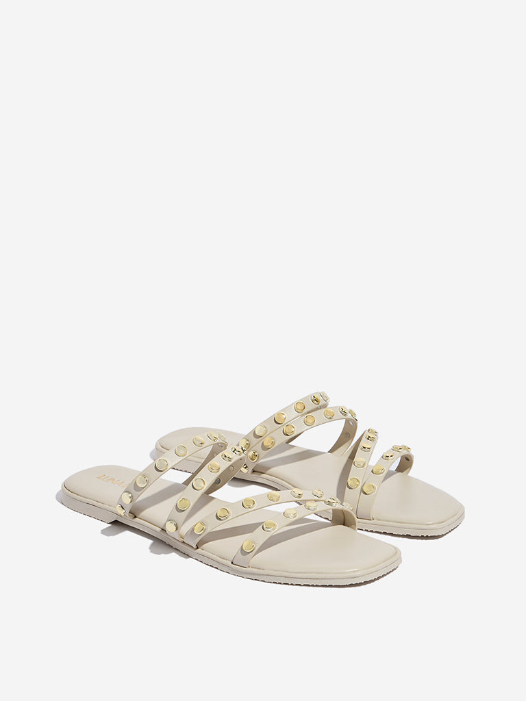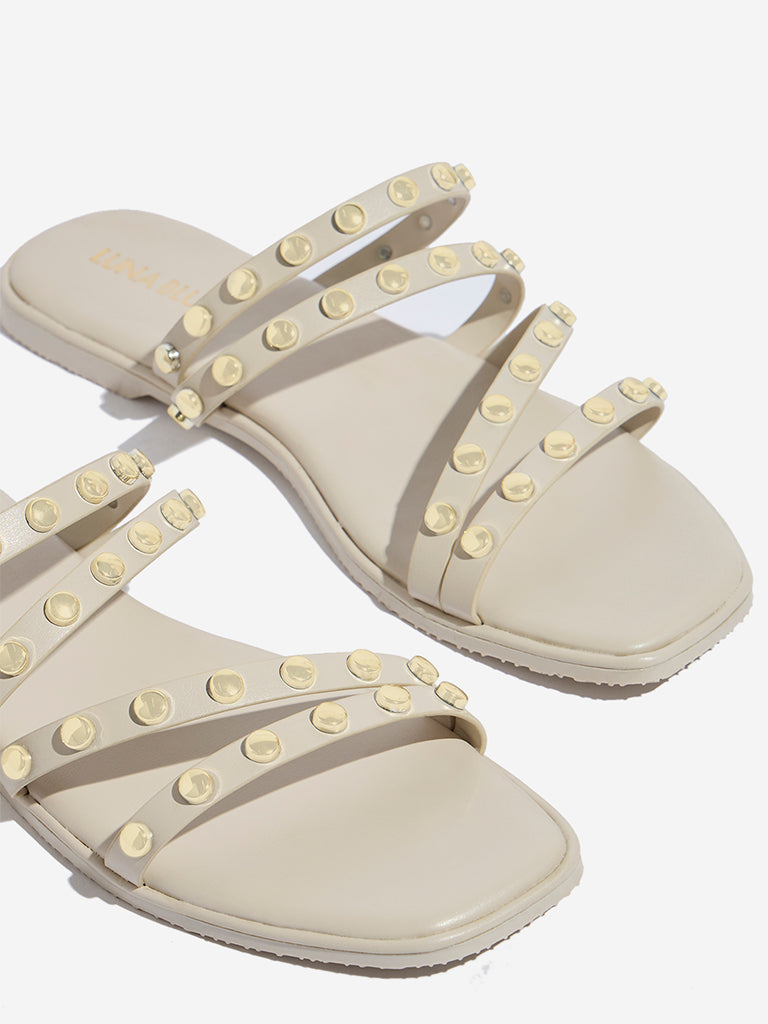 Elevate your casual look with Luna Blu’s ivory slides. designed with a blend of stylish straps and bold gold-toned studs. The soft insole provides all-day comfort. while the textured outsole ensures reliable grip. Perfect for adding a touch of chic edge to your everyday wardrobe. these slides combine modern style with practical comfort.