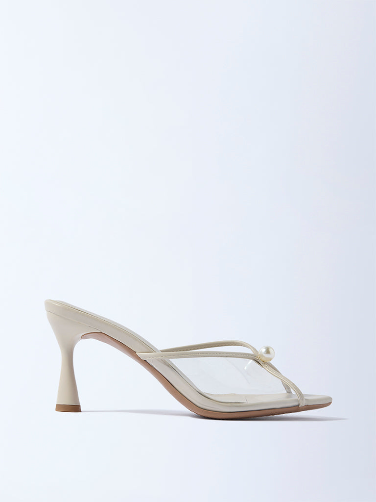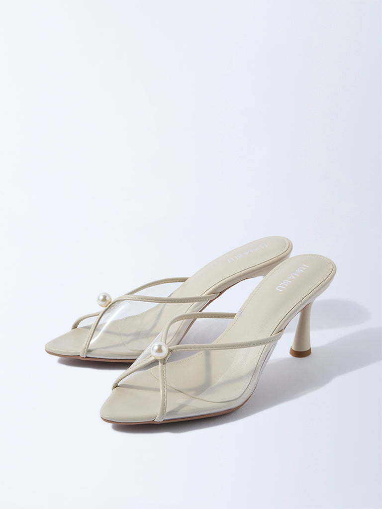 These ivory heel sandals from Luna Blu are designed with delicate vinyl straps accented by a single pearl. lending a clean. minimal aesthetic. The slender mid-heel adds a graceful lift. while the cushioned insole ensures day-long comfort and the textured outsole offers a steady grip. Perfect for occasions that call for subtle sophistication. they complement both contemporary and classic ensembles with ease.