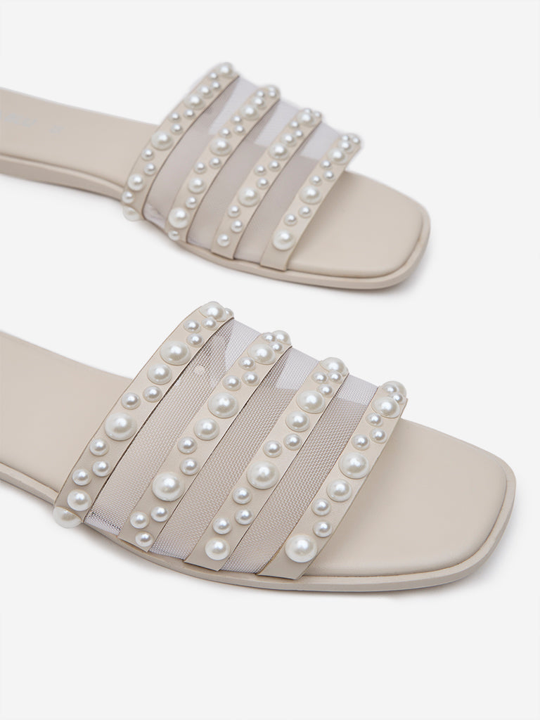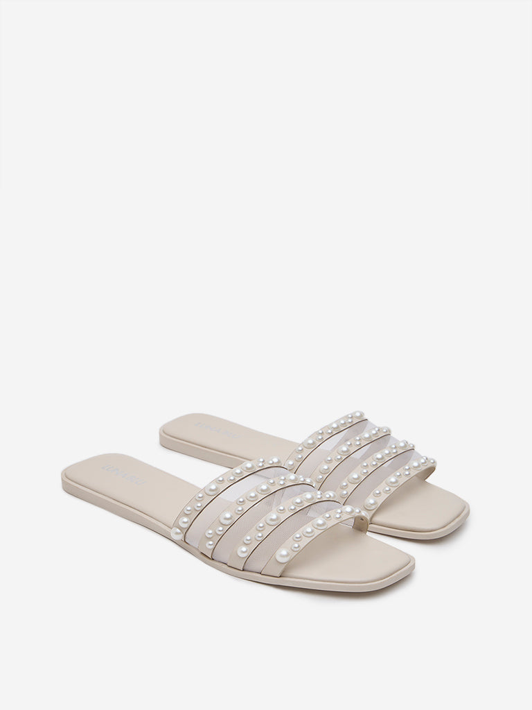 These ivory slides by Luna Blu are adorned with beautiful pearl and mesh detailed upper. Along with style. it balances comfort through its soft insole and textured outsole.