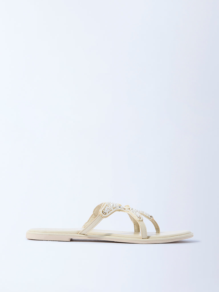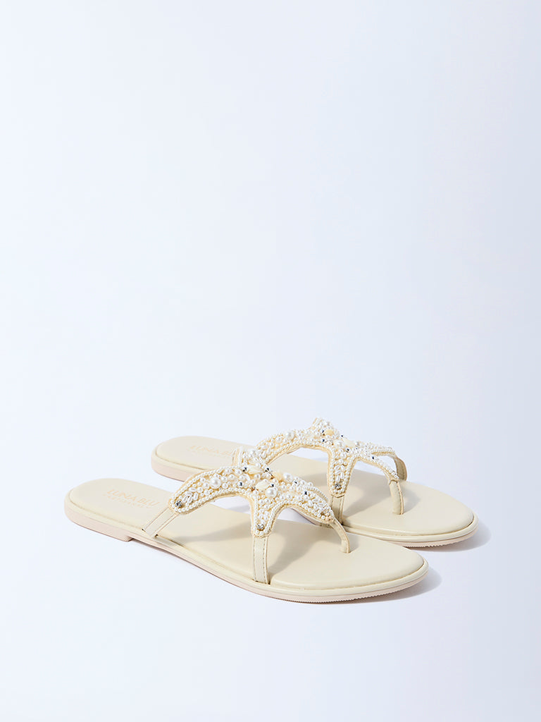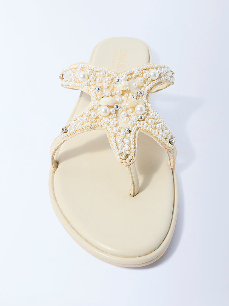 These ivory slides from Luna Blu are embellished with intricate pearlescent embroidery that brings subtle shine to every step. A delicate mix of pearls. beads and crystals adds depth and texture across the strap. while the cushioned footbed ensures comfort without compromising on elegance.